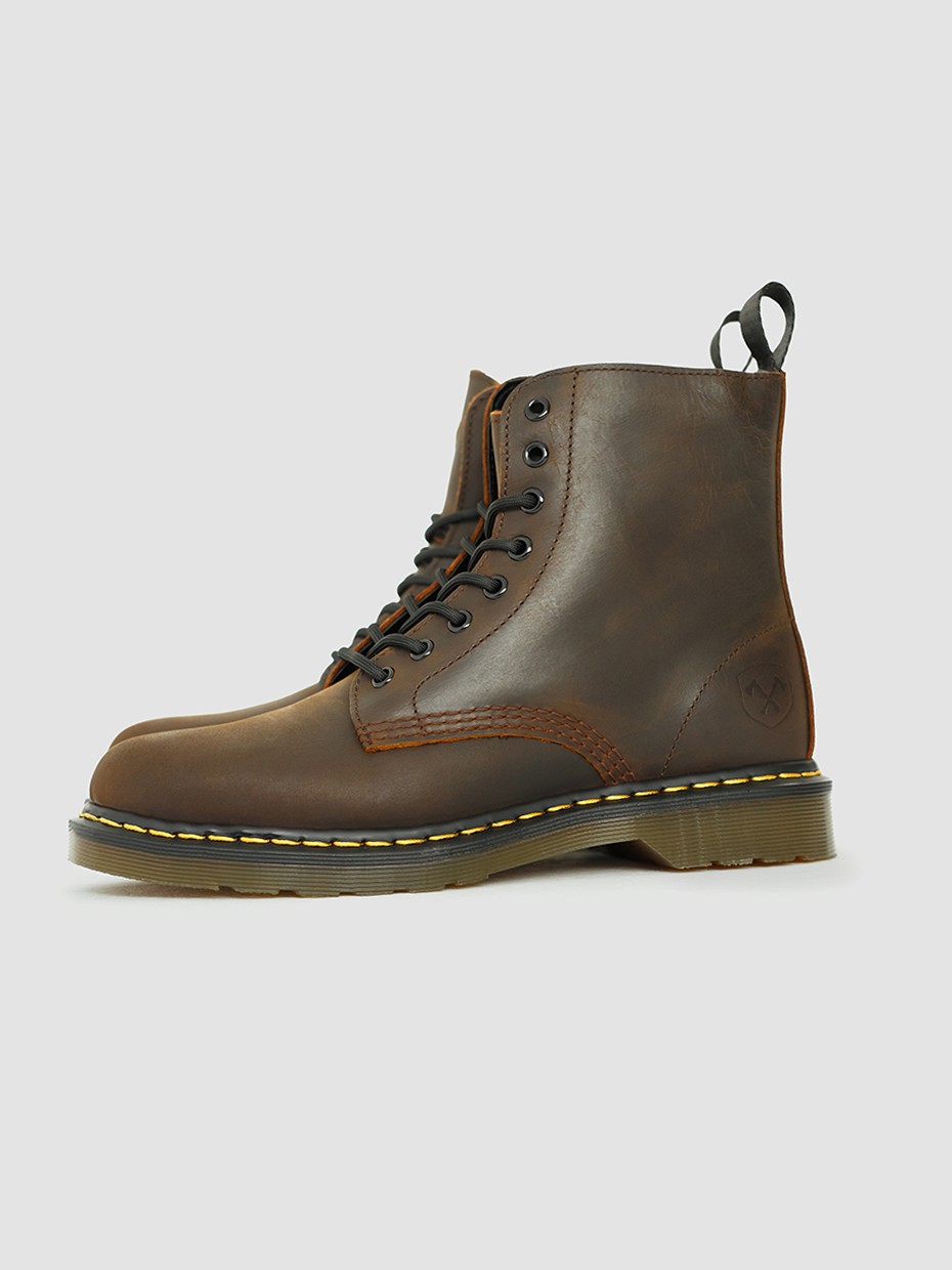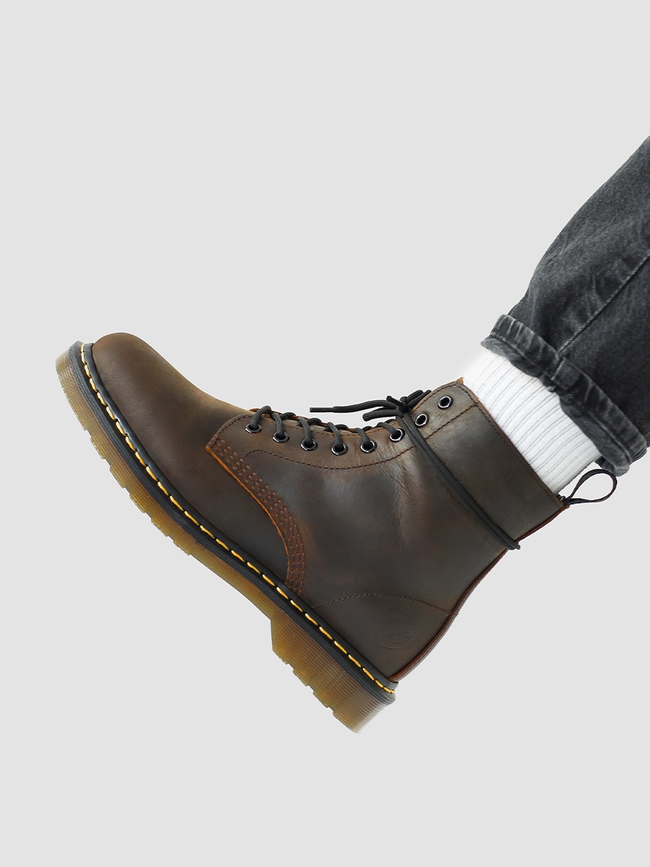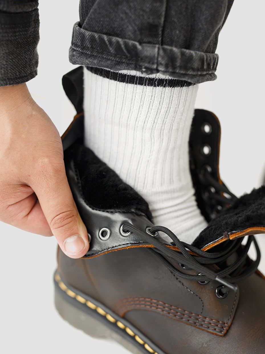 Зимние мужские ботинки 4802AW на 8 люверсов для повседневной носки. Шнуровка регулирует посадку по ноге. Ботинки выполнены из плотной, прочной бычьей кожи толщиной 2мм, которая легко переносит сильные морозы, устойчива к влаге и долговечна. Утеплитель ботинок – настоящий, густой овечий мех. Подошва из ПВХ обеспечивает хорошую теплоизоляцию, прочность и сопротивление холоду. Подошва не лопнет, не будет скользить и имеет хорошее сцепление с поверхностью. В носовой части ботинка между подошвой и внутренней подметкой расположена вставка EVA, которая способствует уменьшению нагрузки на стопу. Ботинки выполнены методом Goodyear Welt. Верхняя часть сшивается с внутренней подметкой и рантом. Рант крепится к подошве с помощью высоких температур. Благодаря чему подошва абсолютно герметична и долговечна. Это делает обувь прочной и надежной.