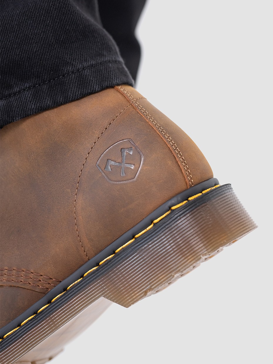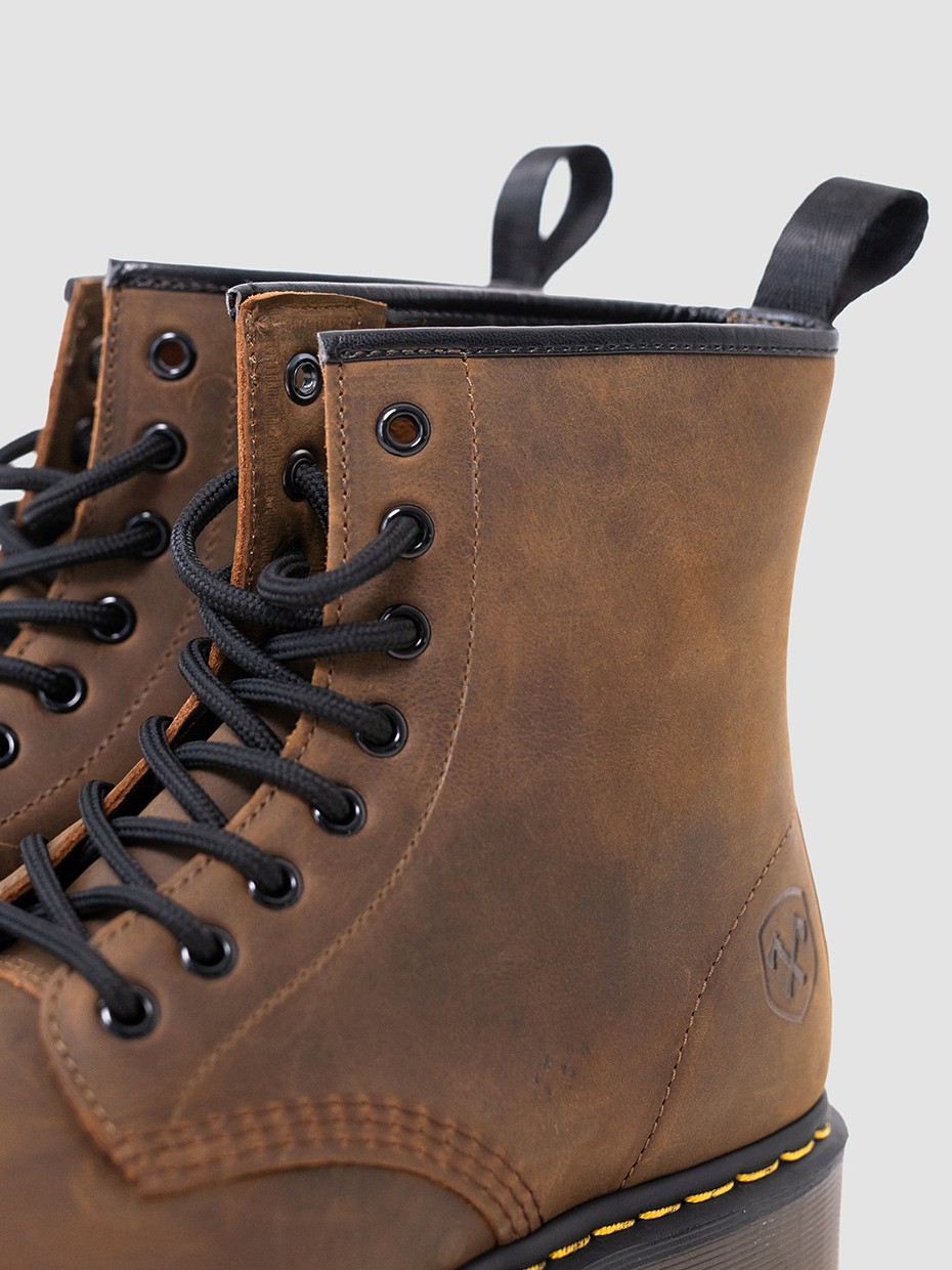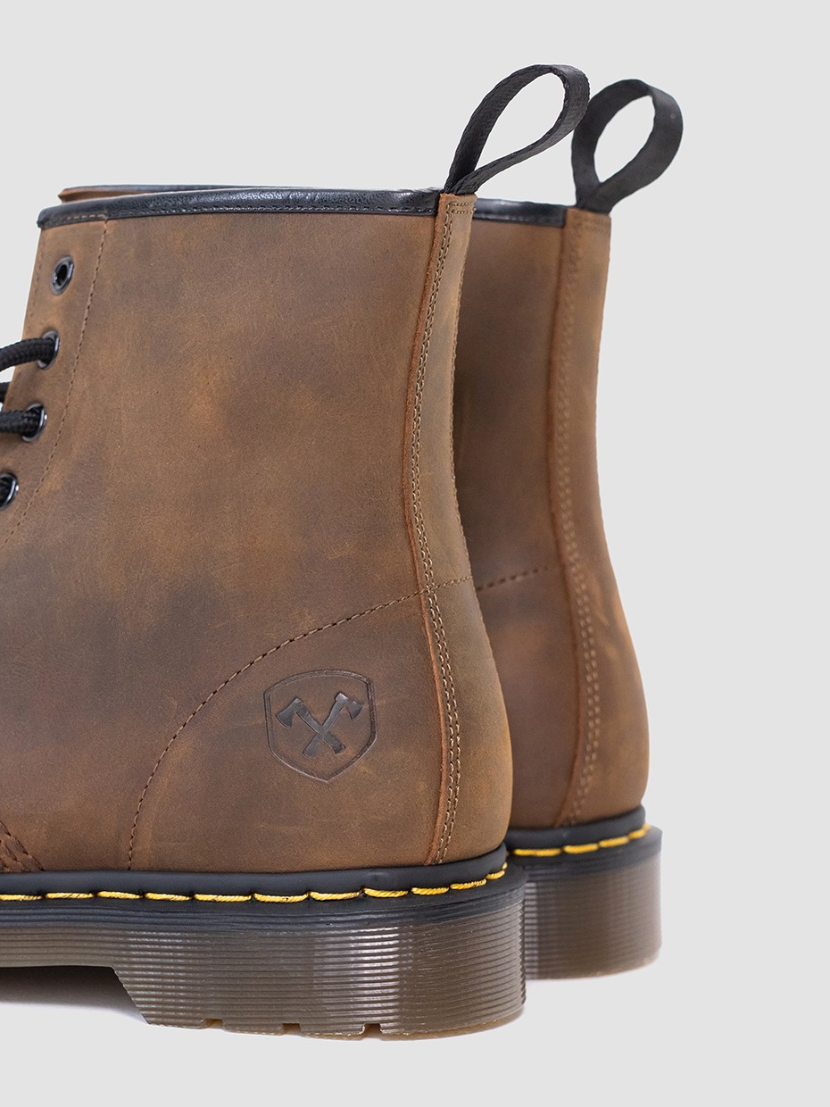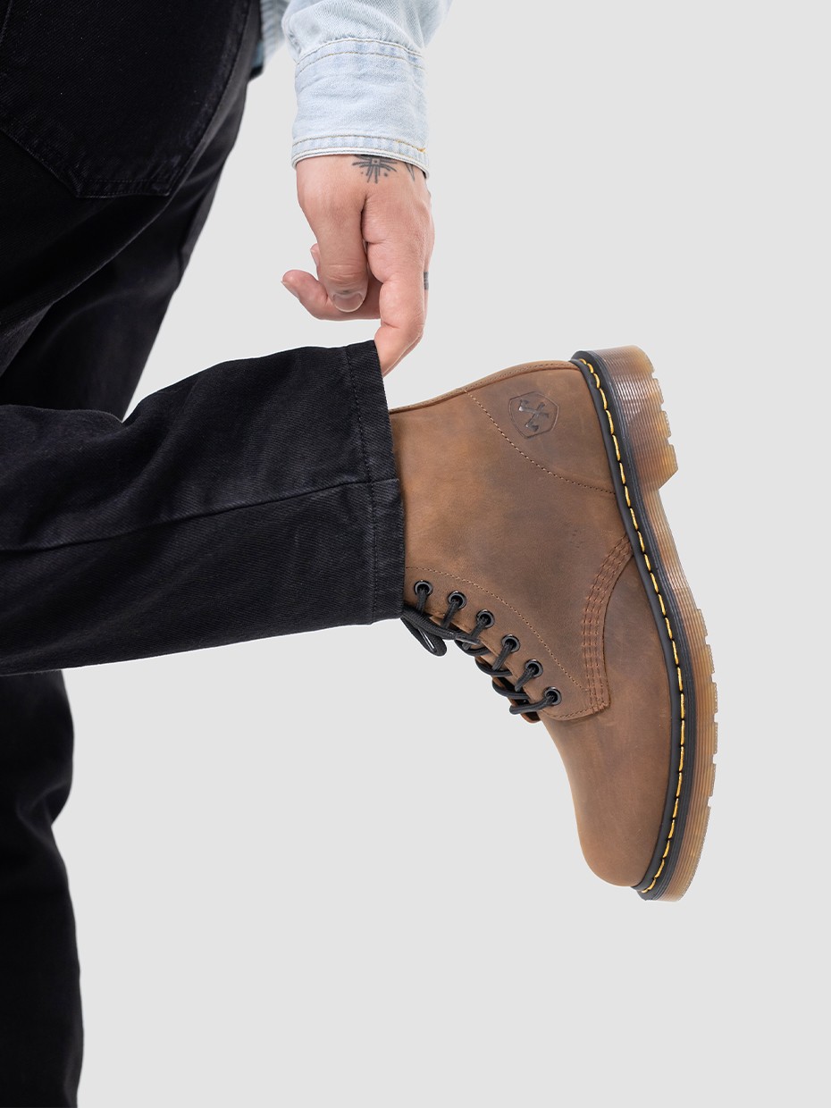 Демисезонные мужские ботинки 4802 на 8 люверсов. Данная модель отлично подходит для повседневной носки. Шнуровка регулирует посадку по ноге. Подносочная часть и задник дополнительно усилены, за счет чего обувь наделяется повышенной прочностью. Съемные стельки обеспечивают мягкость, комфорт движения и дополнительную амортизацию. В данной модели ботинок используется натуральная бычья кожа. Толщина кожи 1,8-2мм. Кожа легко переносит сильные морозы, устойчива к влаге и долговечна. Подошва полуботинок выполнена из ПВХ обеспечивает хорошую теплоизоляцию, прочность и сопротивление холоду. Подошва имеет хорошее сцепление с поверхностью. В носовой части ботинка между подошвой и внутренней подметкой расположена вставка EVA, которая способствует уменьшению нагрузки на стопу. Ботинки выполнены методом Goodyear Welt. Верхняя часть сшивается с внутренней подметкой и рантом. Рант крепится к подошве с помощью высоких температур. Благодаря чему подошва абсолютно герметична и долговечна. Это делает обувь прочной и надежной. Невысокий каблук позволяет поддерживать стопу в правильном положении и усиливает стабильность шага. Петельки сзади помогают обуваться одним движением.