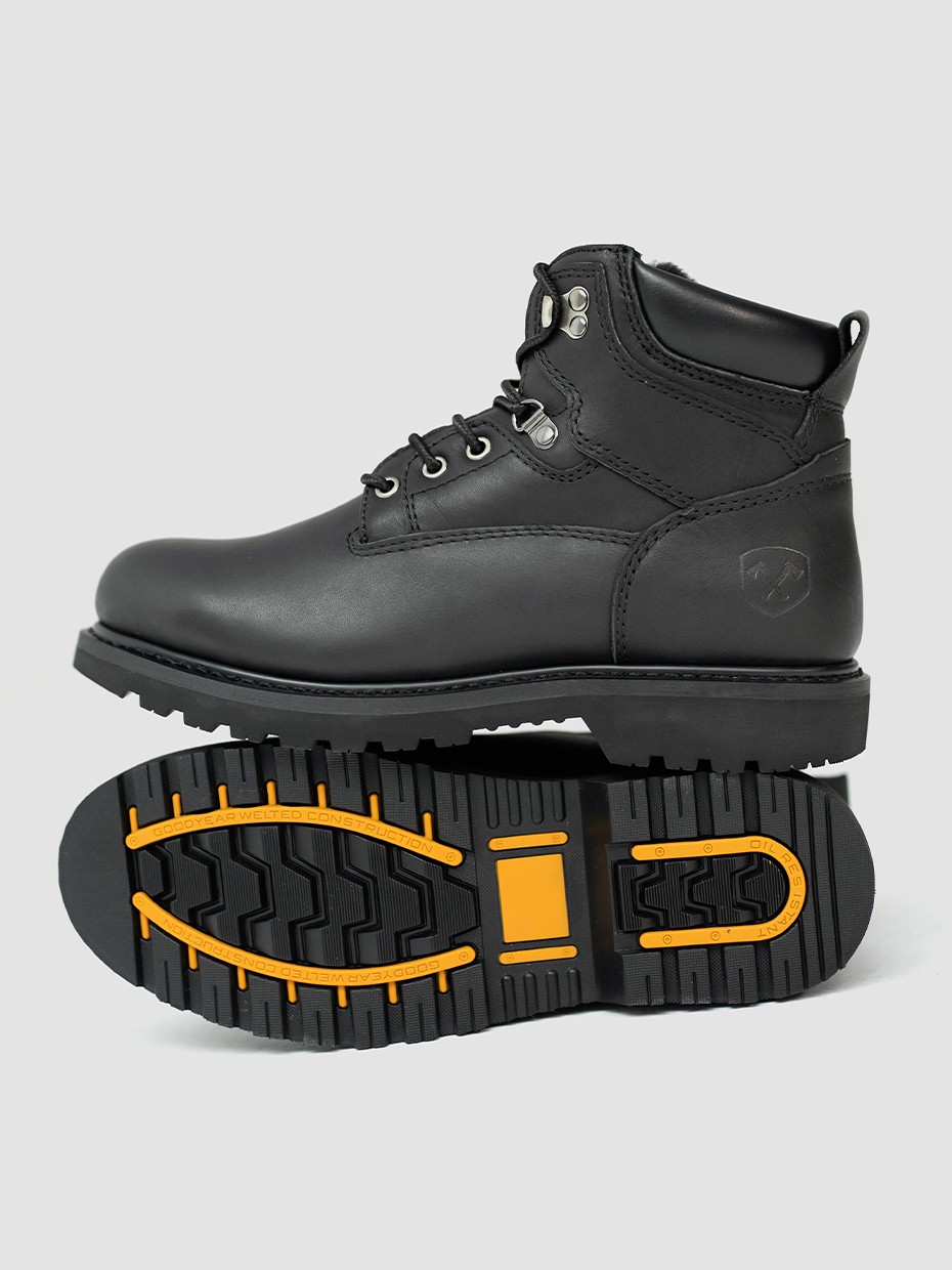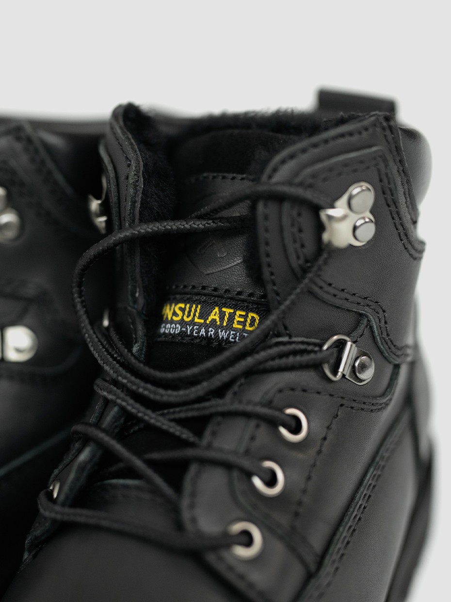 Зимние мужские ботинки Armor. Данная модель отлично подходит для повседневной носки. При производстве ботинок используется натуральная бычья кожа, которая легко переносит сильные морозы, устойчива к влаге и долговечна. Окраска производится процессом водного окрашивания в красильных ваннах с сохранением натурального рисунка лицевой стороны – морщинки и поры, которые имеются на необработанной шкуре. После окрашивания кожу обрабатывают маслом с добавлением натуральной смолы, чтобы она стала мягче. Толщина кожи 1,8-2мм. Объемный задний мягкий кант способствует плотной и удобной посадке на ноге, а также предотвращает попадание снега внутрь обуви. Утеплитель ботинок – настоящий, густой овечий мех. Подносочная часть и задник дополнительно усилены, за счет чего обувь наделяется повышенной прочностью. Подошва ботинок, выполненная из резины, обладает отличными противоскользящими свойствами, не промерзает даже в сильный мороз, а также устойчива к агрессивным факторам среды. Подошва не лопнет, не будет скользить и имеет хорошее сцепление с поверхностью. Ботинки выполнены методом Goodyear Welt. Верхняя часть сшивается с внутренней подметкой и рантом. Рант крепится к подошве с помощью высоких температур. Благодаря чему подошва абсолютно герметична и долговечна. Это делает обувь прочной и надежной.