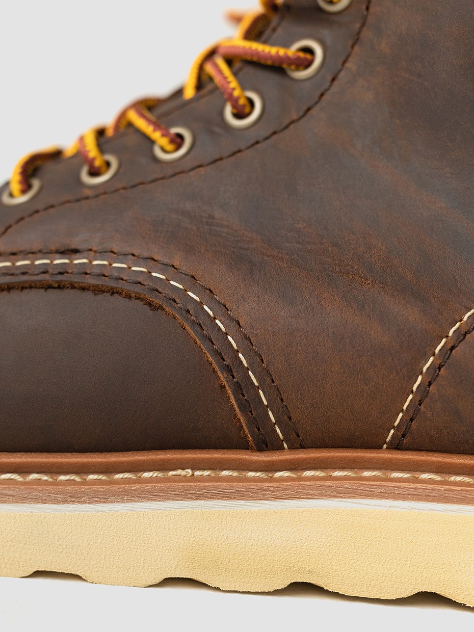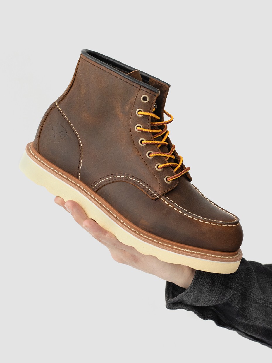 Демисезонные мужские ботинки Lary Moc Toe из натуральной кожи на 7 люверсов для повседневной носки. Демисезонные мужские ботинки из натуральной кожи сочетают премиальный стиль, инновационные технологии комфорта и непревзойденное качество. Шнуровка регулирует посадку по ноге, позволяет быстро обуваться, а контрастный рант на ботинках придает образу особую утонченность. Монохромный верх ботинок и практичная акцентная подошва смотрятся стильно и актуально. Подносочная часть и задник дополнительно усилены, за счет чего обувь наделяется повышенной прочностью. Съемные стельки обеспечивают мягкость, комфорт движения и дополнительную амортизацию. В данной модели ботинок используется натуральная бычья кожа импортированная из Америки. Толщина кожи 1,8-2мм. Кожа устойчива к влаге и долговечна. Подошва из резины обеспечивает хорошую теплоизоляцию, прочность и сопротивление холоду. Подошва не лопнет, не будет скользить и имеет хорошее сцепление с поверхностью. Ботинки выполнены методом Goodyear Welt. Верхняя часть сшивается с внутренней подметкой и рантом. Рант крепится к подошве с помощью высоких температур. Благодаря чему подошва абсолютно герметична и долговечна. Это делает обувь прочной и надежной. Плоская подошва позволяет поддерживать стопу в правильном положении и усиливает стабильность шага. Сбоку ботинки дополняет тиснение с логотипом бренда.