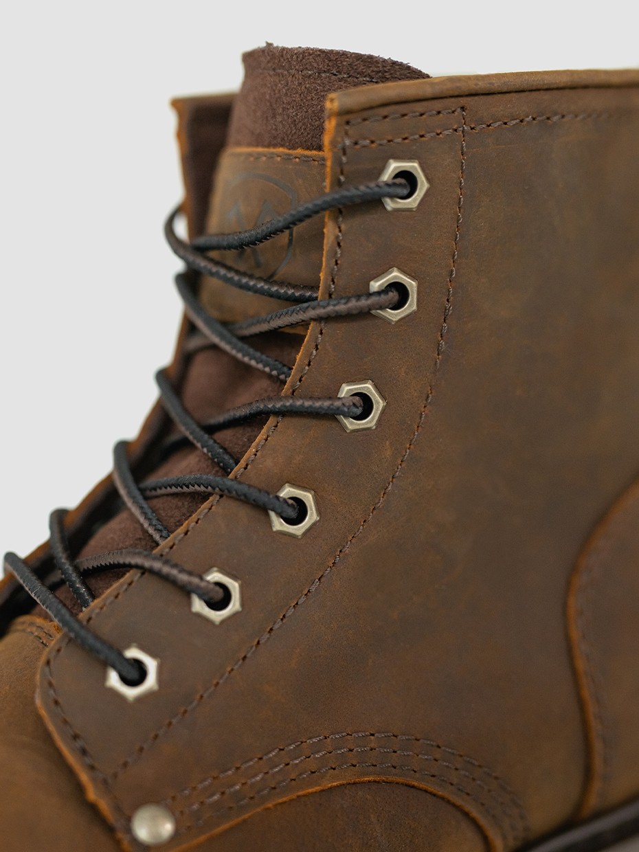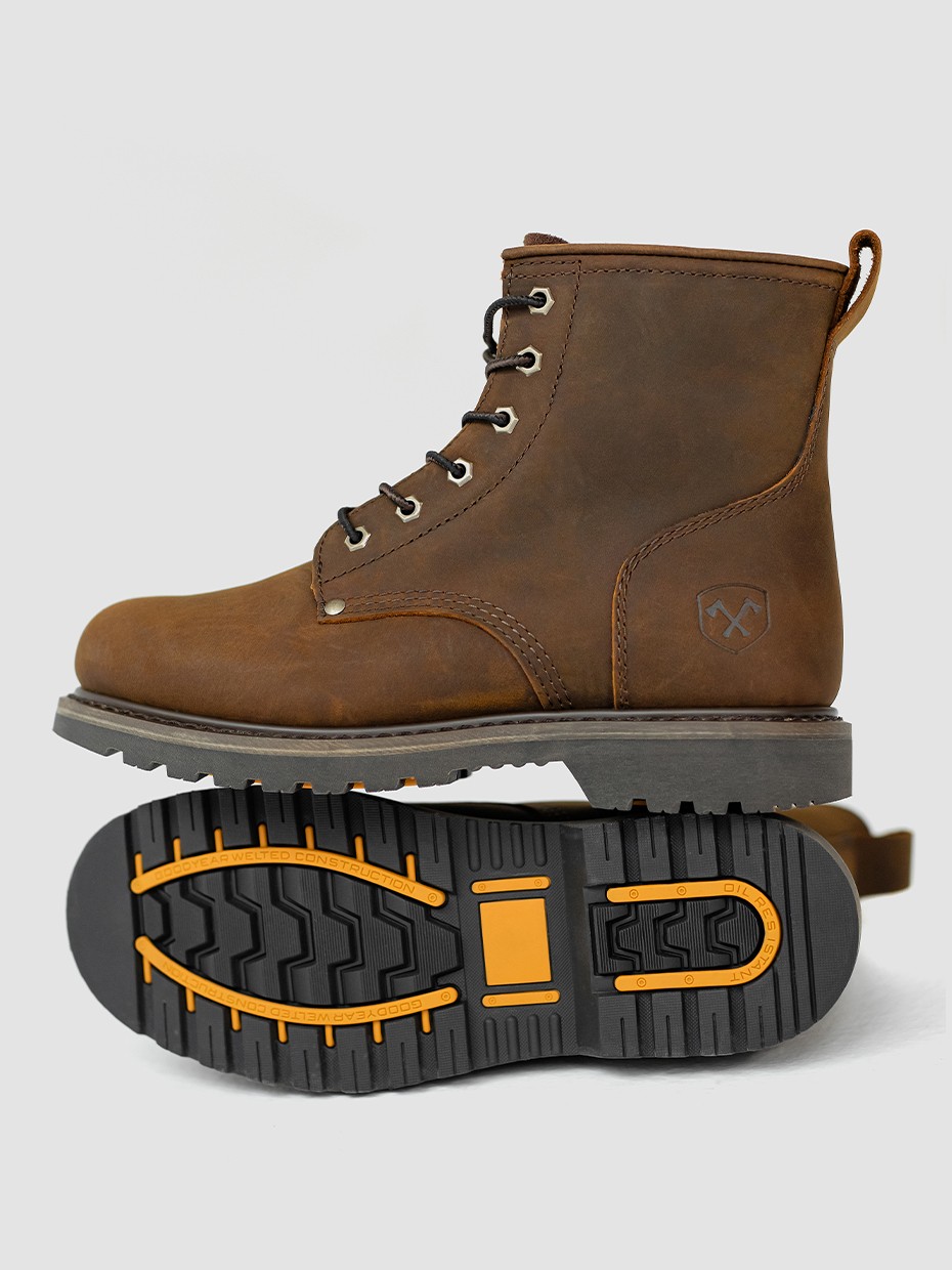 Демисезонные мужские ботинки Shield. Данная модель отлично подходит для повседневной носки. При производстве ботинок используется натуральная бычья кожа, которая легко переносит сильные морозы, устойчива к влаге и долговечна. Подносочная часть и задник дополнительно усилены, за счет чего обувь наделяется повышенной прочностью. Подошва ботинок, выполненная из резины, обладает отличными противоскользящими свойствами, не промерзает даже в сильный мороз, а также устойчива к агрессивным факторам среды. Подошва не лопнет, не будет скользить и имеет хорошее сцепление с поверхностью. Ботинки выполнены методом Goodyear Welt. Верхняя часть сшивается с внутренней подметкой и рантом. Рант крепится к подошве с помощью высоких температур. Благодаря чему подошва абсолютно герметична и долговечна. Это делает обувь прочной и надежной.
