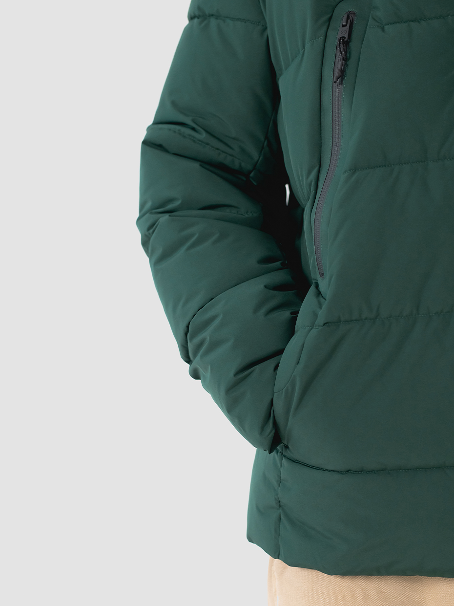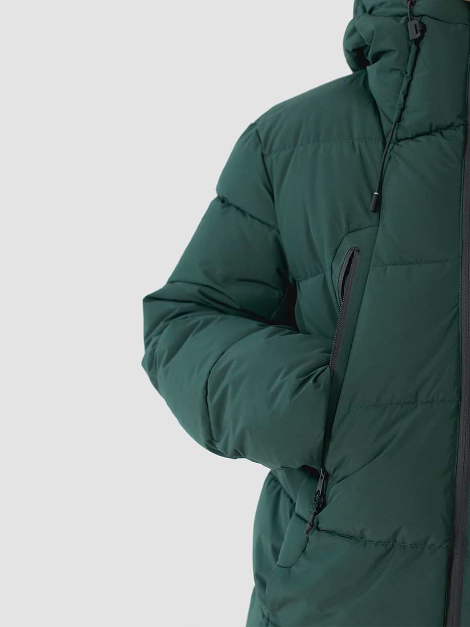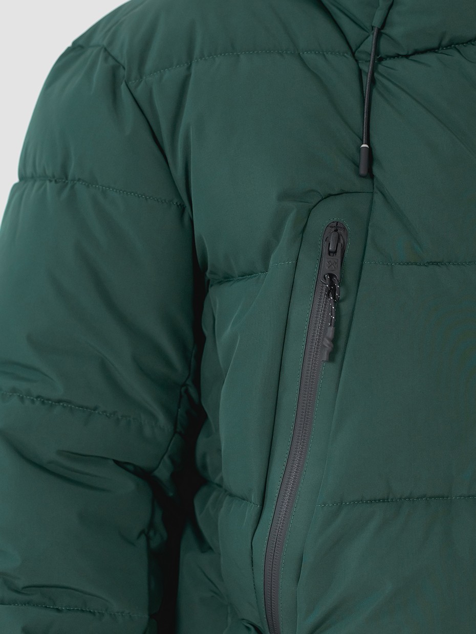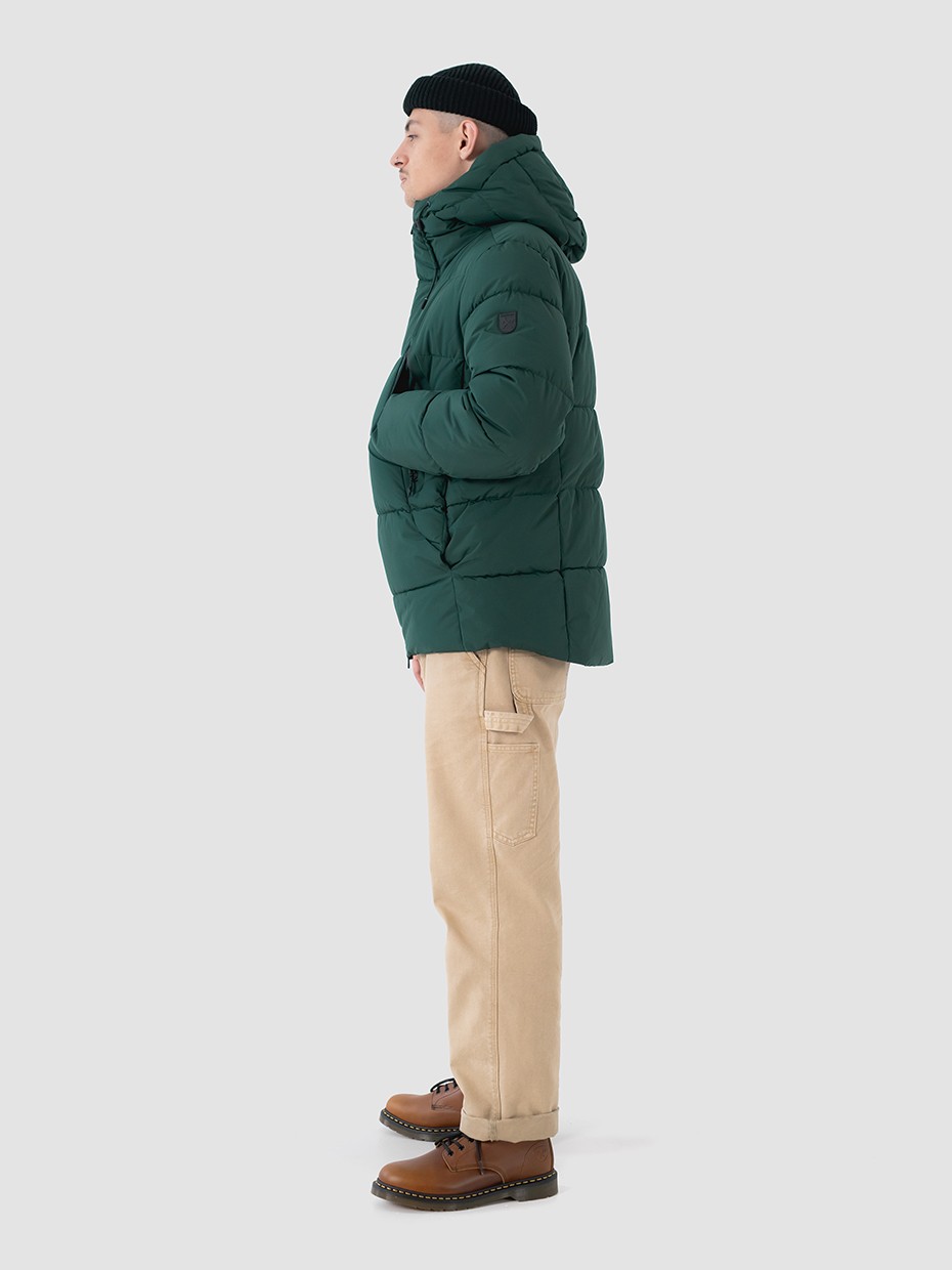 Зимний мужской пуховик Anik, изготовленный из качественной водооталкивающей ткани. Оверсайз крой. Короткая куртка застегивается на водонепроницаемую двухзамковую молнию производства фирмы YKK с внутренним ветрозащитным клапаном. Эластичные манжеты рукавов с прорезями под большие пальцы обеспечивают надежное прилегание к руке. 2 нагрудных внешних кармана на водонепроницаемой молнии. 2 кармана на магнитах, расположены в боковых швах, благодаря чему куртка выглядит минималистично, без потери функциональности. Объемный воротник обеспечивает защиту от ветра. Объемный несъемный капюшон регулируется эластичным шнуром с фиксаторами. Резиновый логотип на левом плече дополняет стеганый пуховик. Карман на рукаве для карт. Внутри куртки дополнительный карман на молнии. Куртка выполнена из ткани мембрана – качественная курточная ткань с мембранной отделкой с водоупорностью до 5000 мм и паропроницаемостью до 5000 г/м2/24 часа. Ткани с такой обработкой надежно защищают от воды и снега. В качестве утеплителя взят материал био-пух DuPont Sorona – по термоизолирующим характеристикам идентичен натуральному птичьему пуху, но при этом имеет ряд преимуществ, таких как эластичность, негигроскопичность и гипоаллергенность.