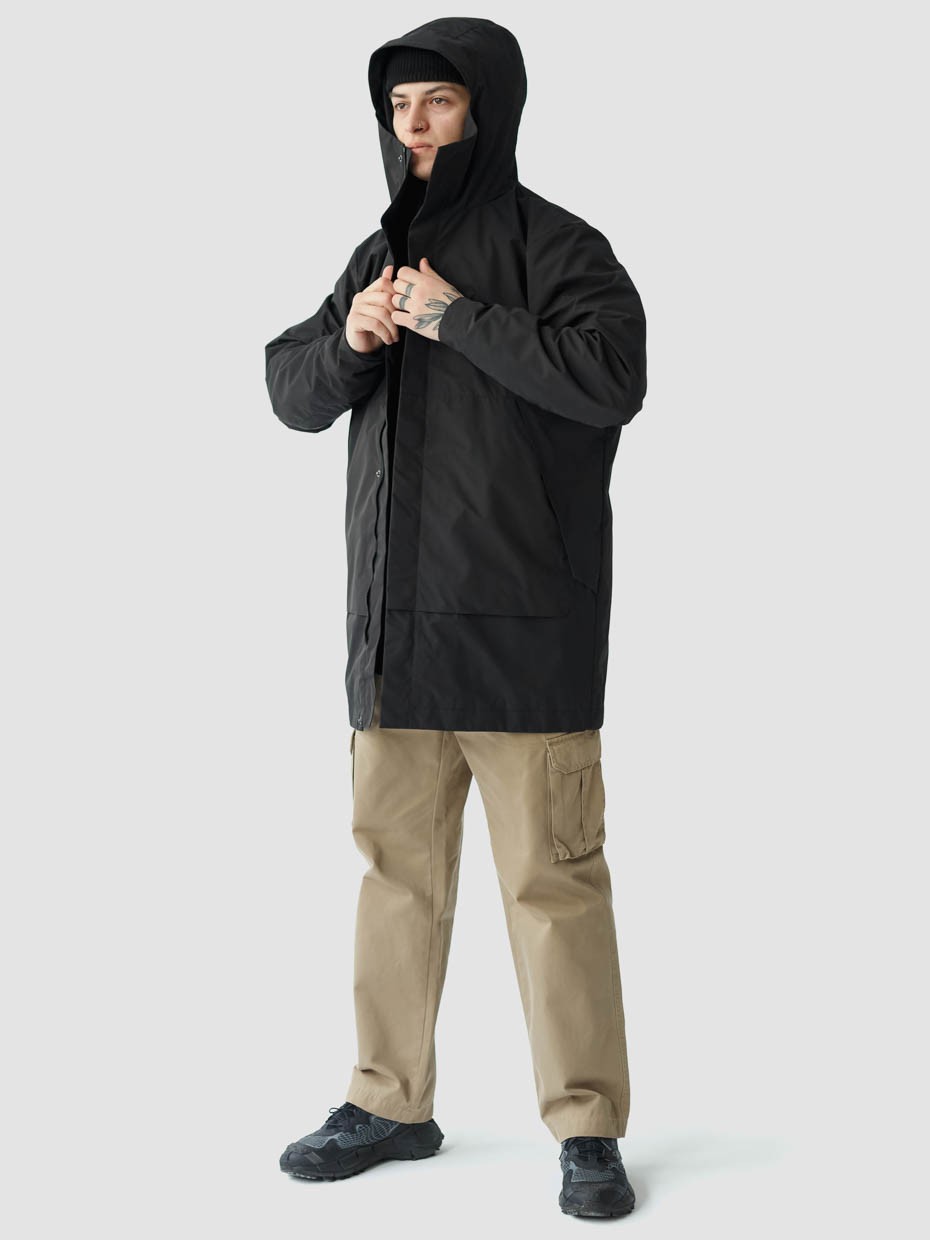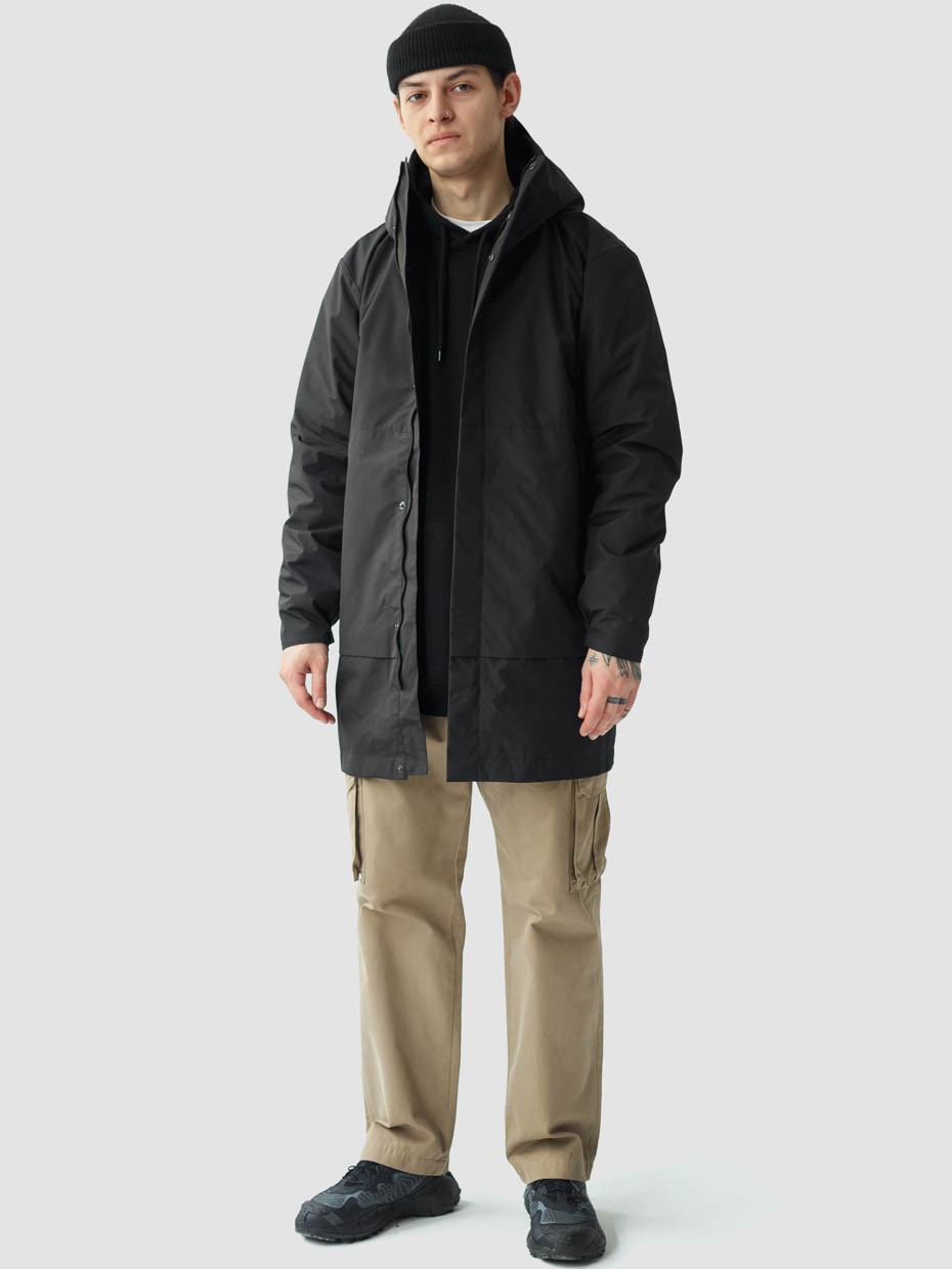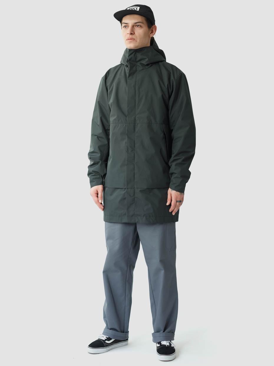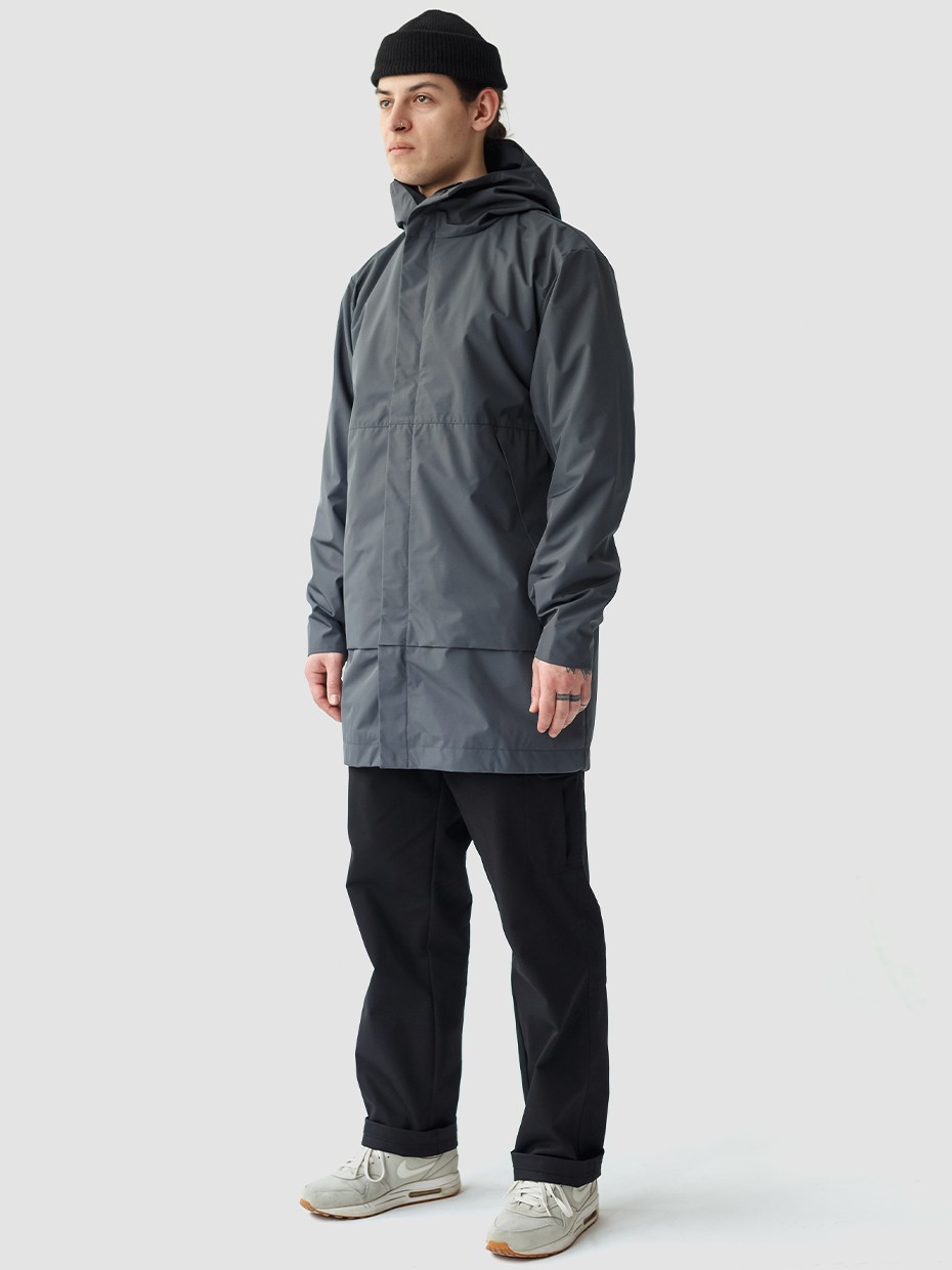 Удлиненная куртка Doug выполнена из мембранной ткани c WR пропиткой. Куртка прямого силуэта без утеплителя. Несъемный капюшон с небольшим козырьком надежно защитит от дождя и ветра. Глубина капюшона регулируется утяжкой с фиксатором. Двухзамковая молния, закрывается ветрозащитной планкой на металлических кнопках по всей длине. Ширина запястья регулируется металлическими кнопками. Два накладных боковых кармана на молнии, которые закрываются декоративной планкой и два внутренних кармана.