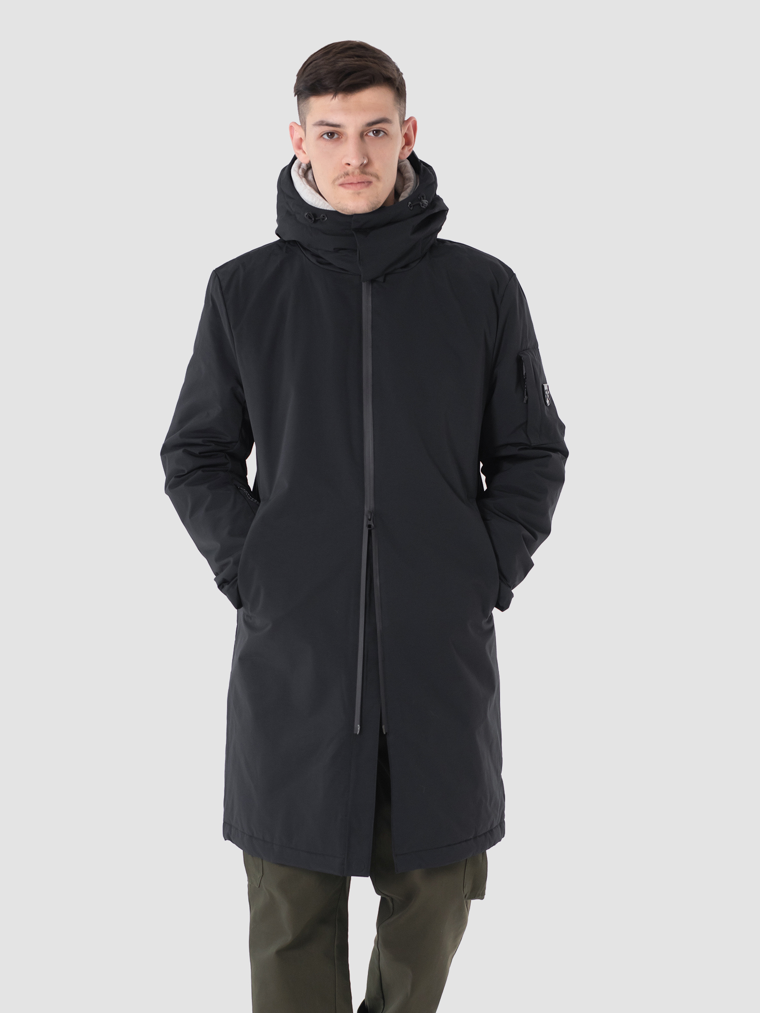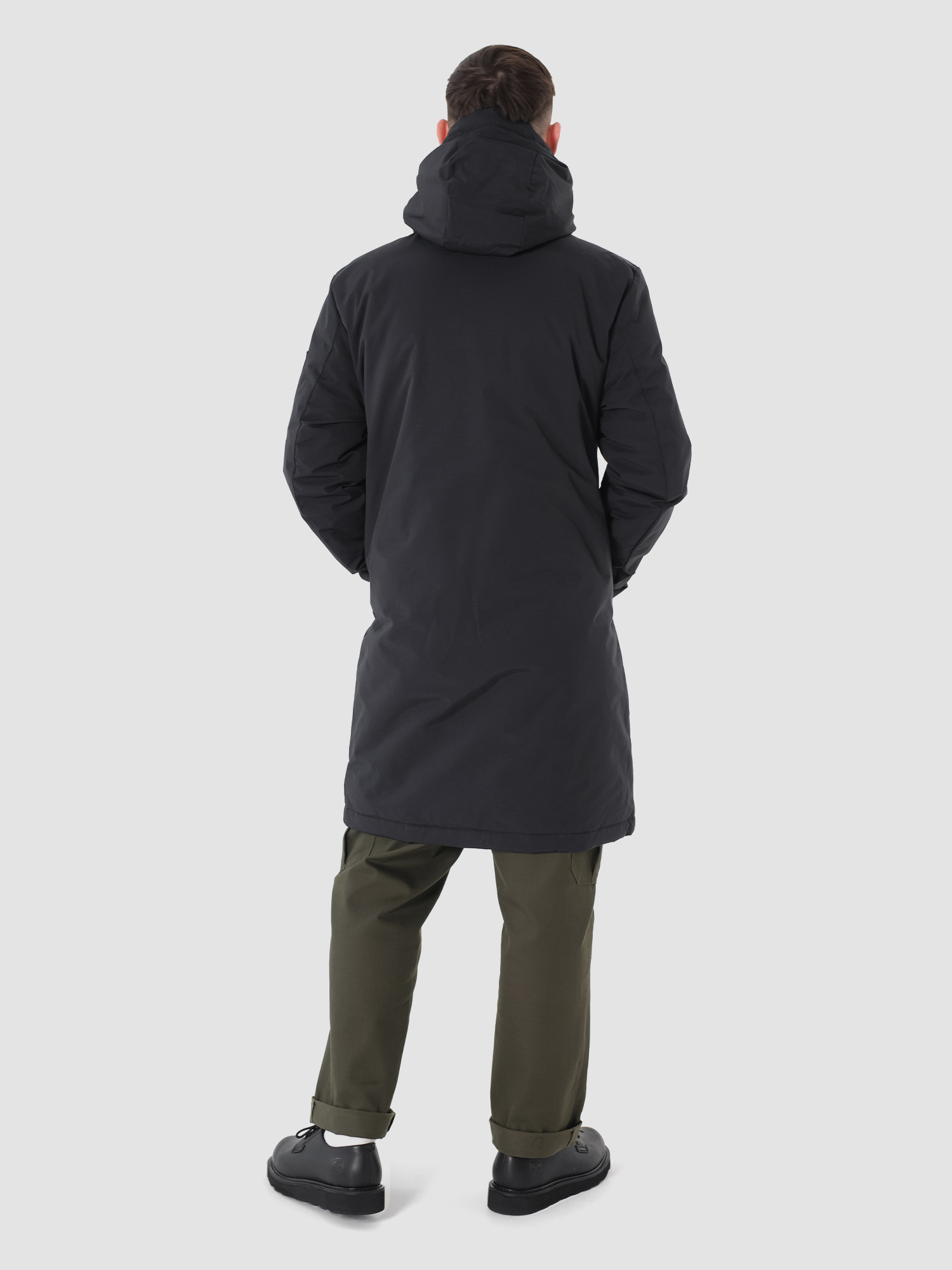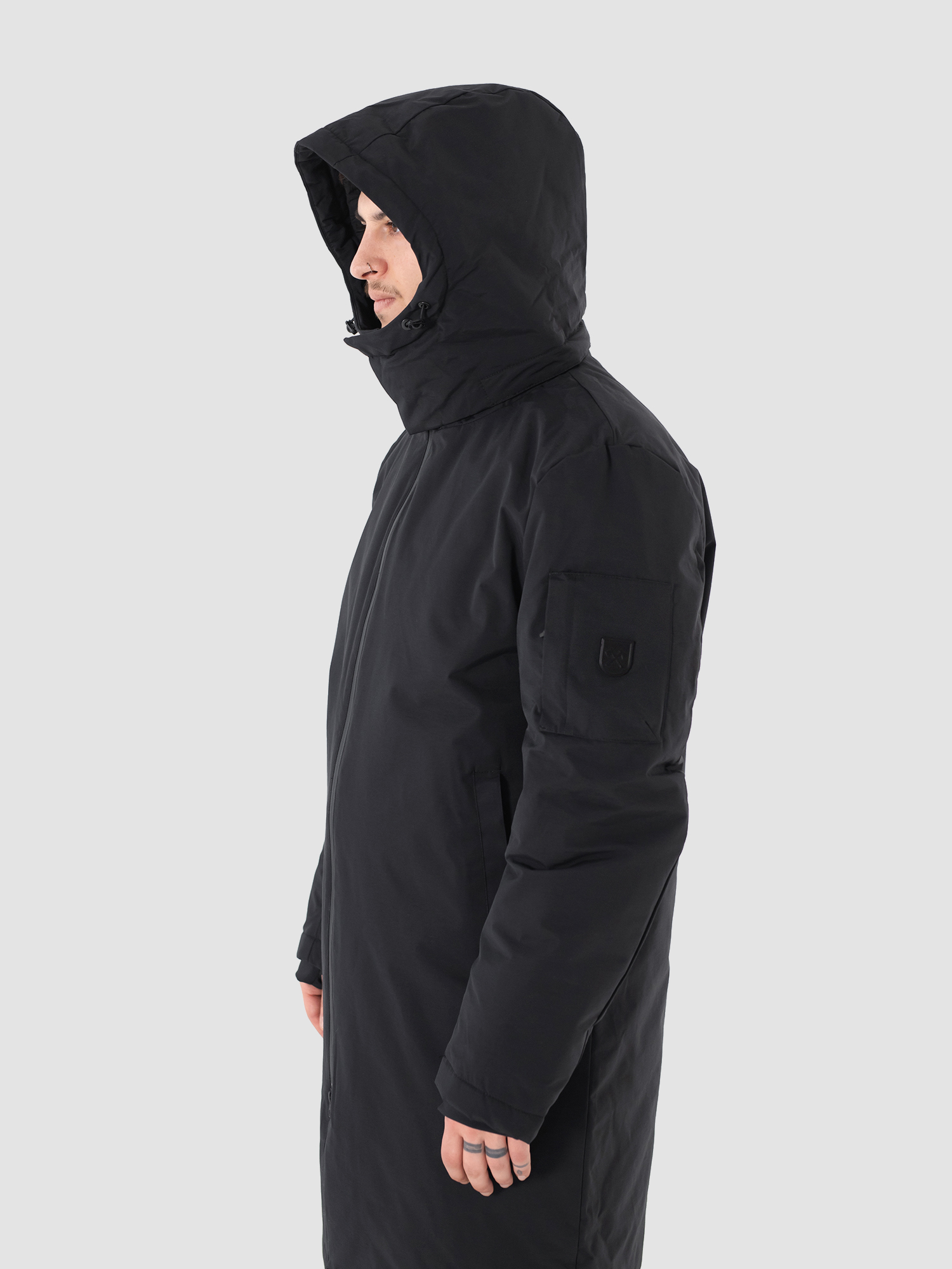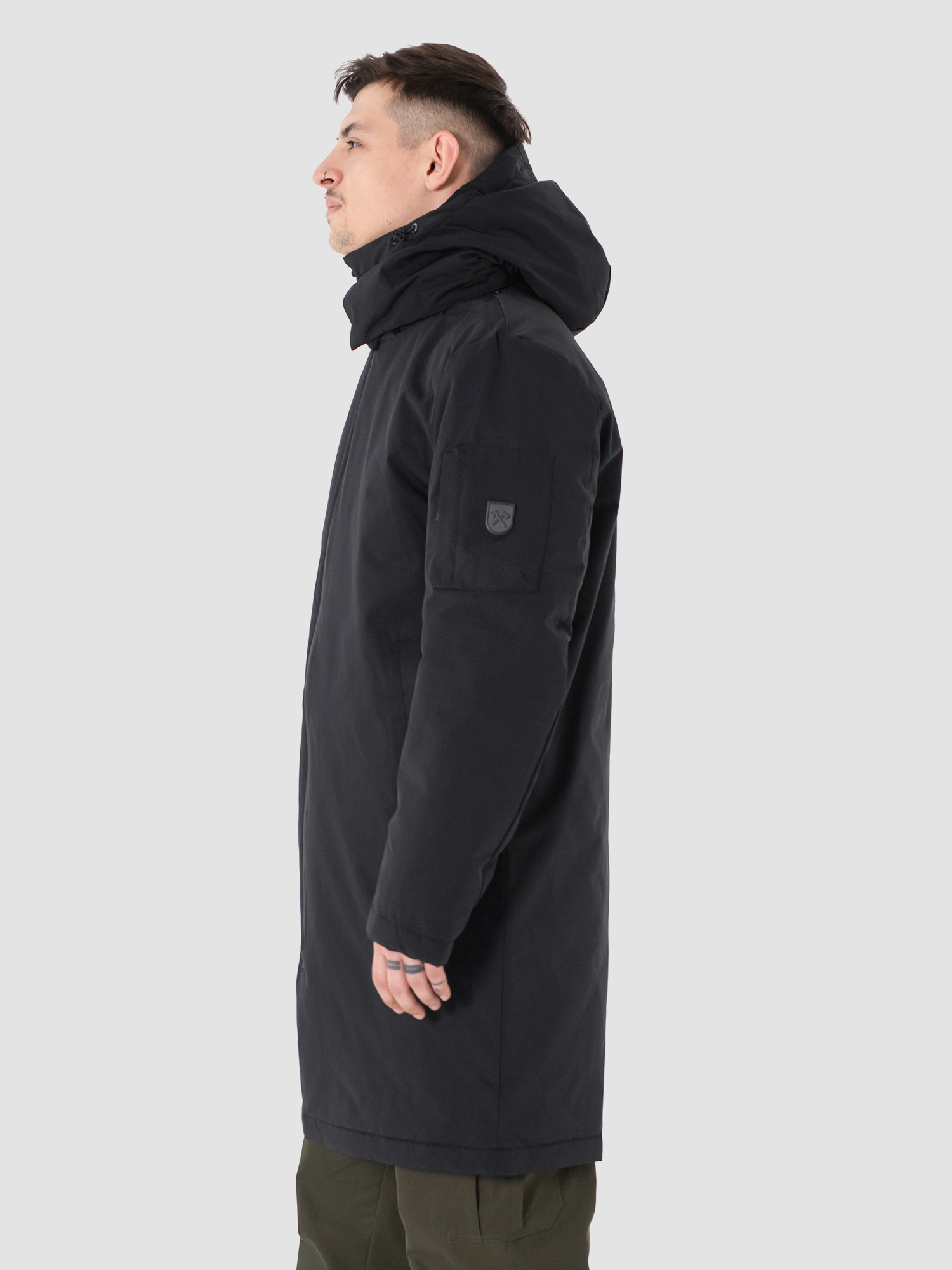 Утепленная мужская куртка Kotlin прямого кроя с центральной застежкой на двухзамковой молнии производства фирмы YKK и внутренней ветрозащитной планкой. Съемный регулируемый капюшон. Высокий воротник надежно защищает от ветра и осадков. Рукава с внутренними трикотажными манжетами с прорезями под большие пальцы обеспечивают плотное прилегание к руке. Глубокие боковые карманы на водонепроницаемой молнии и один карман на молнии на левом рукаве. Потайной карман на правом рукаве. Внутренний карман на молнии. Металлический логотип на левом плече дополняет образ. Длинная куртка выполнена из ткани “мембрана” — качественная курточная ткань с мембранной отделкой с водоупорностью до 5000 мм и паропроницаемостью до 5000 г/м2/24 ч. Ткани с такой обработкой надежно защищают от воды и снега. В качестве утеплителя взят материал биопух DuPont Sorona: по термоизолирующим характеристикам идентичен натуральному птичьему пуху, но при этом имеет ряд преимуществ, таких как эластичность, негигроскопичность и гипоаллергенность.