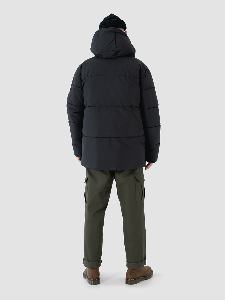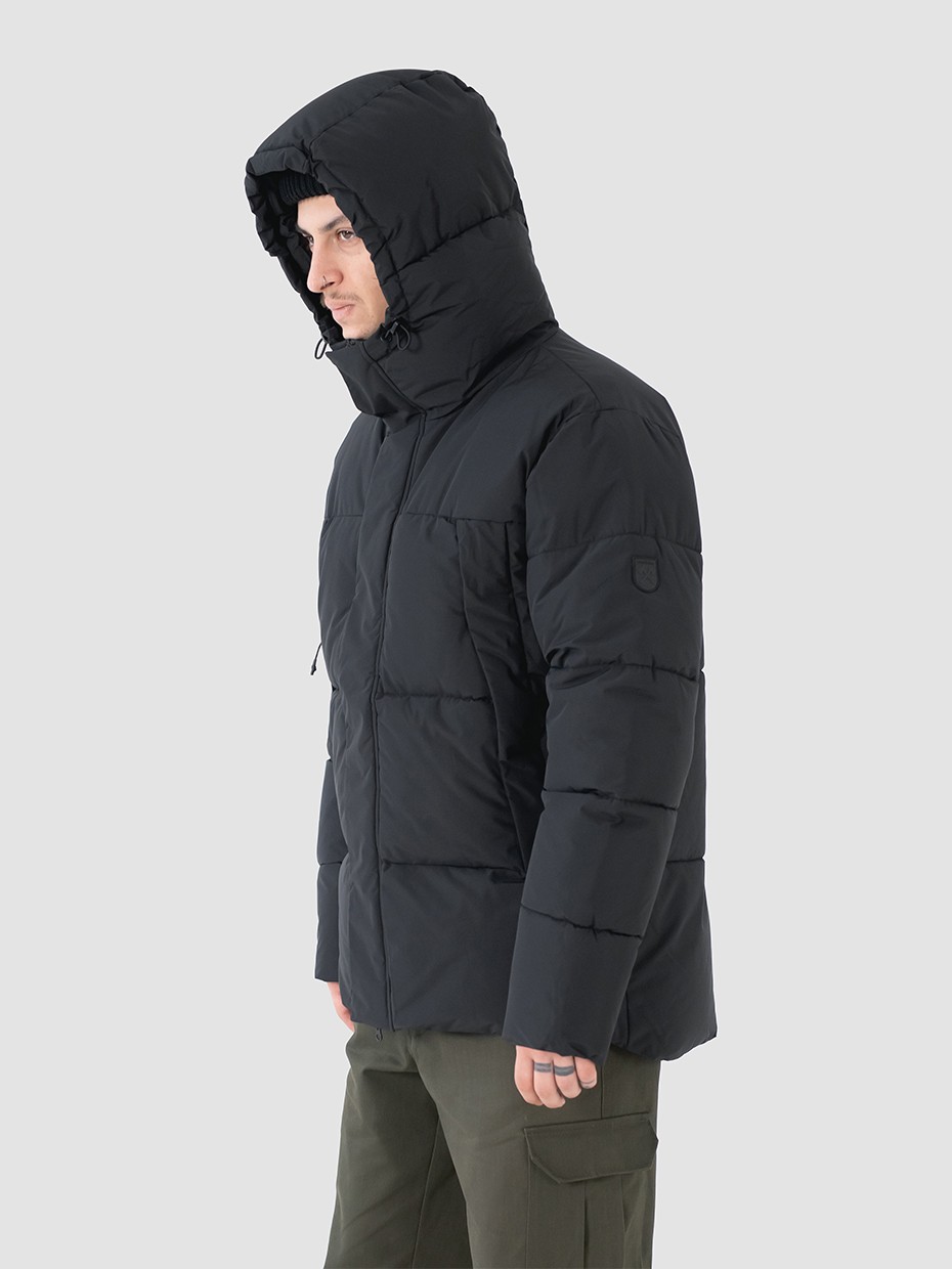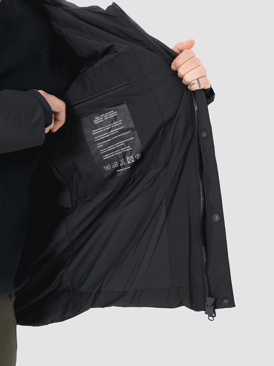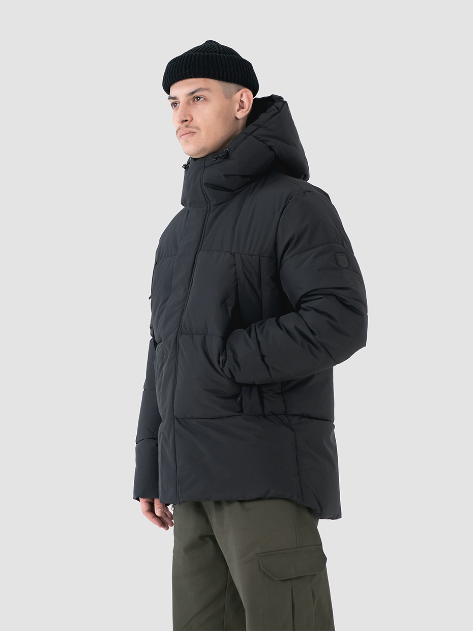 Зимний мужской пуховик, изготовленный из качественной водооталкивающей ткани. Оверсайз крой. Укороченная куртка с центральной застежкой на двухзамковой молнии производства фирмы YKK с ветрозащитной планкой на магнитных кнопках. Эластичные манжеты рукавов с прорезями под большие пальцы обеспечивают надежное прилегание к руке. 2 вместительных боковых внешних кармана на молнии, закрывающиеся клапаном на магнитах. Объемный воротник обеспечивает защиту от ветра. Объемный несъемный капюшон регулируется эластичным шнуром с фиксаторами. Резиновый логотип на левом плече дополняет стеганый пуховик. Карман на рукаве для карт. Внутри куртки дополнительный карман на молнии.