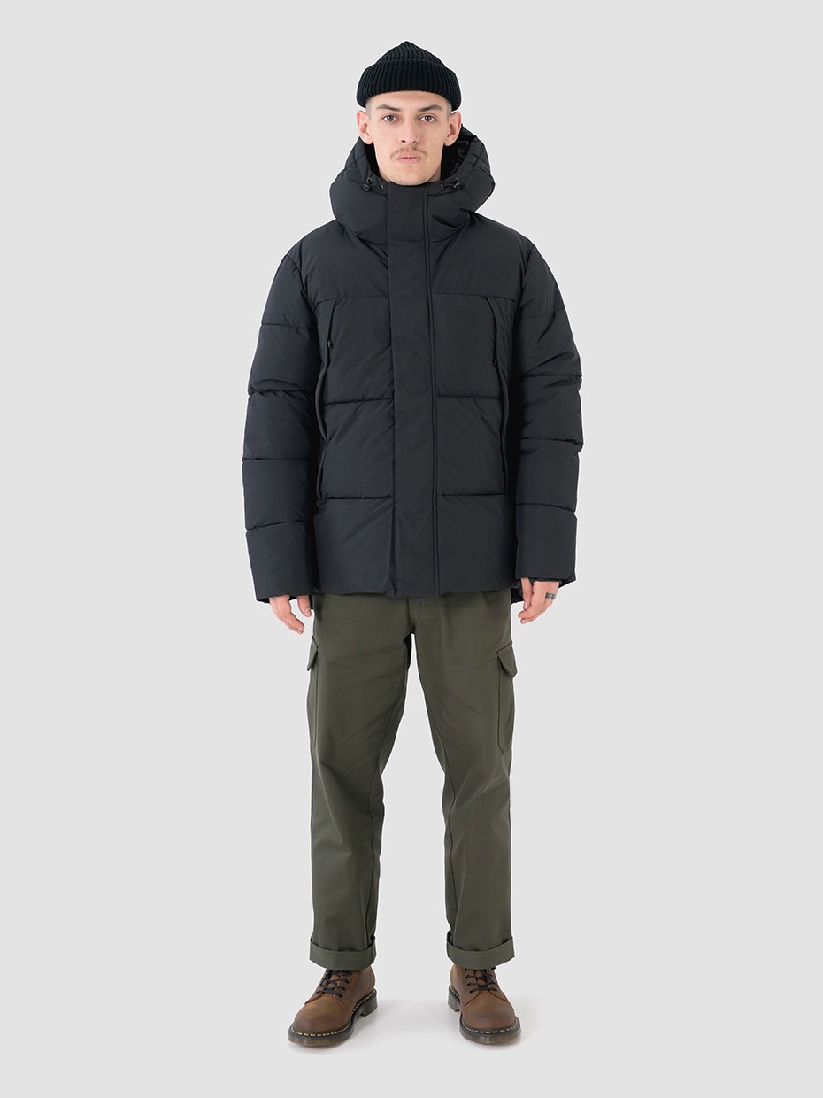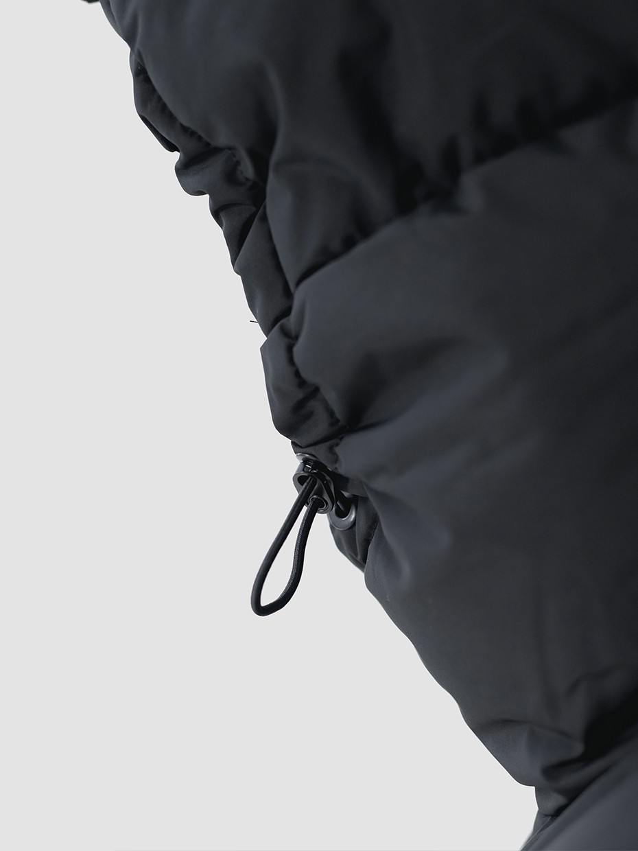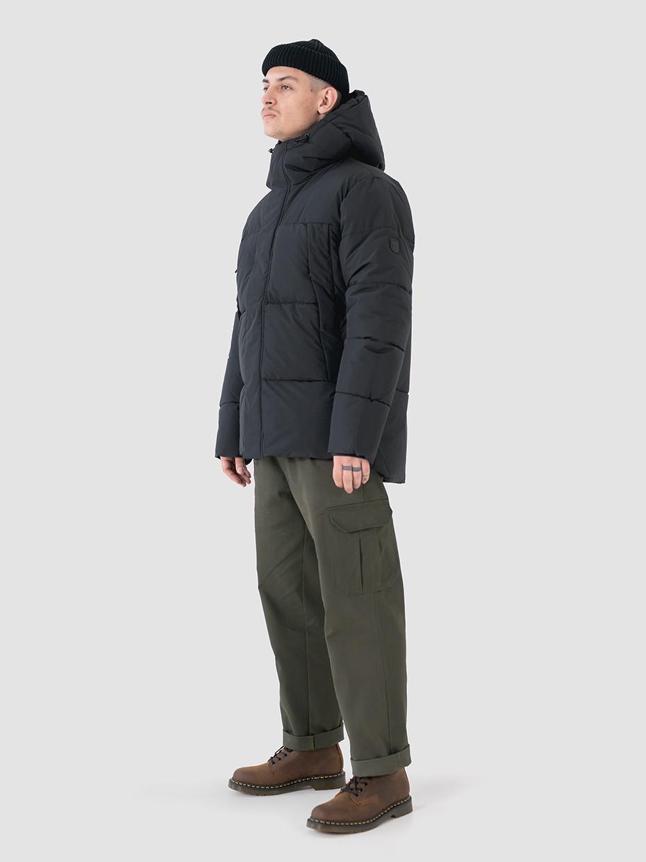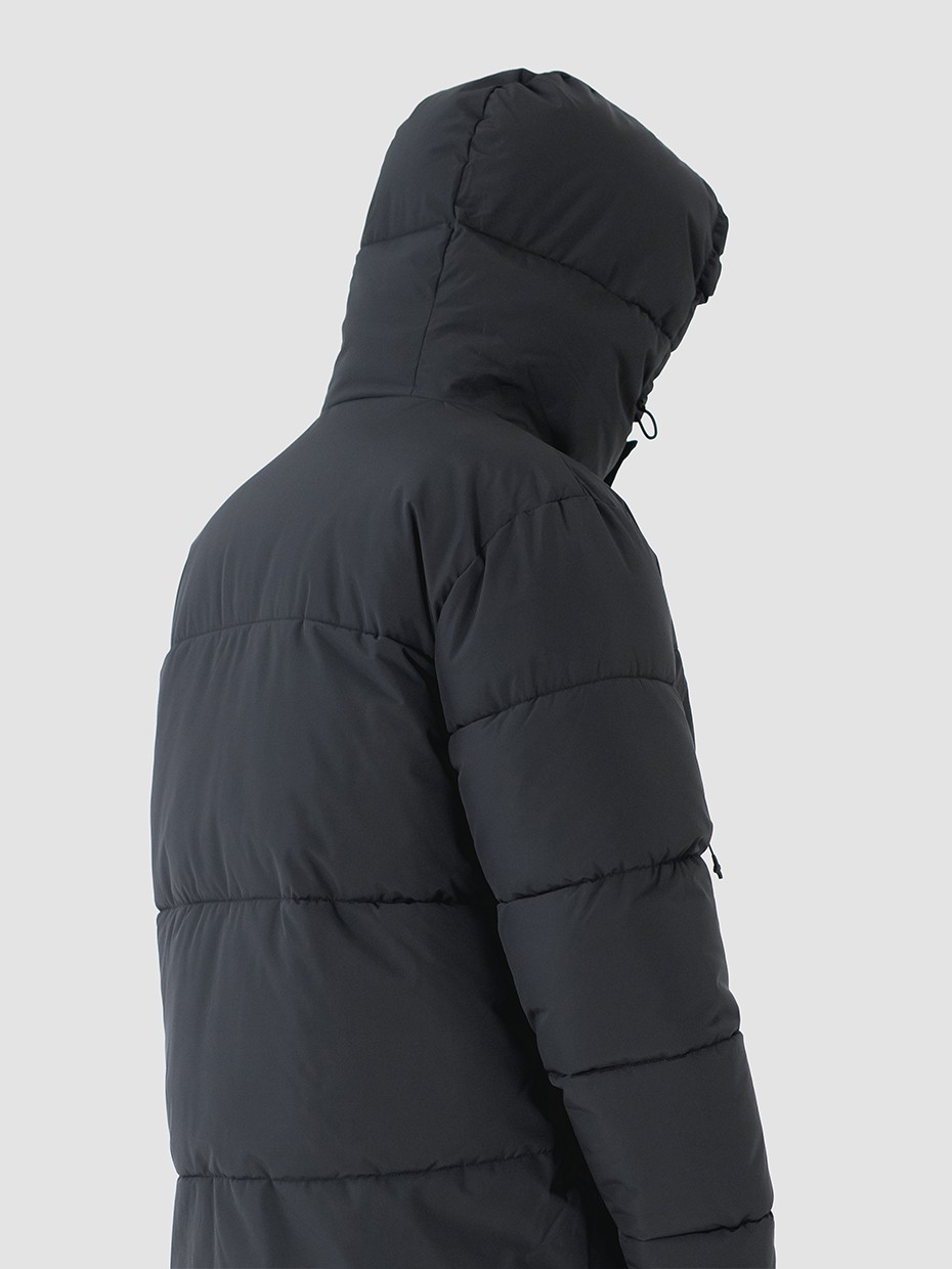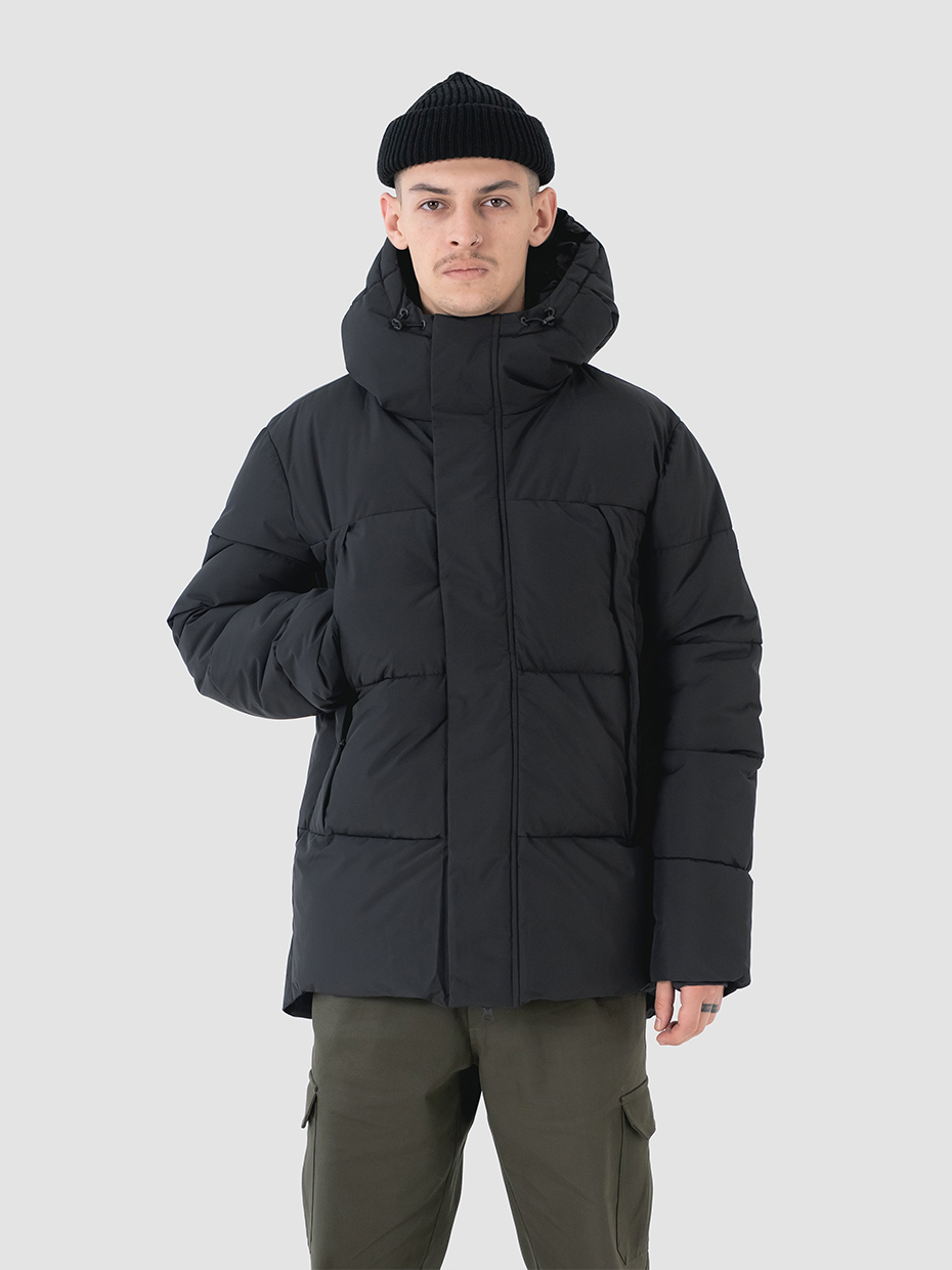 Зимний мужской пуховик, изготовленный из качественной водооталкивающей ткани. Оверсайз крой. Укороченная куртка с центральной застежкой на двухзамковой молнии производства фирмы YKK с ветрозащитной планкой на магнитных кнопках. Эластичные манжеты рукавов с прорезями под большие пальцы обеспечивают надежное прилегание к руке. 2 вместительных боковых внешних кармана на молнии, закрывающиеся клапаном на магнитах. Объемный воротник обеспечивает защиту от ветра. Объемный несъемный капюшон регулируется эластичным шнуром с фиксаторами. Резиновый логотип на левом плече дополняет стеганый пуховик. Карман на рукаве для карт. Внутри куртки дополнительный карман на молнии.