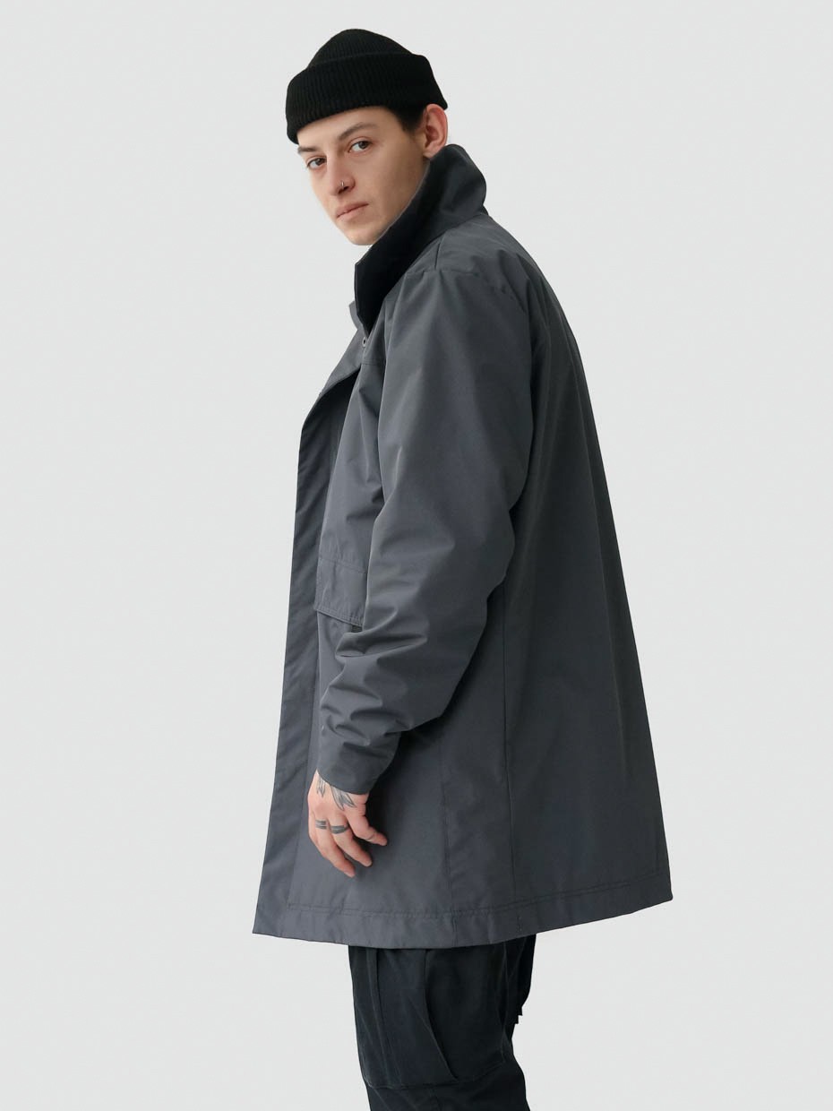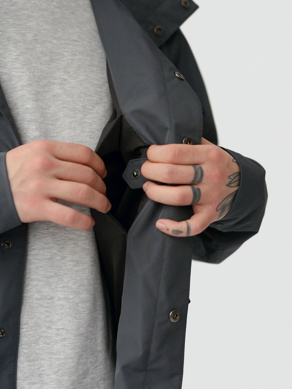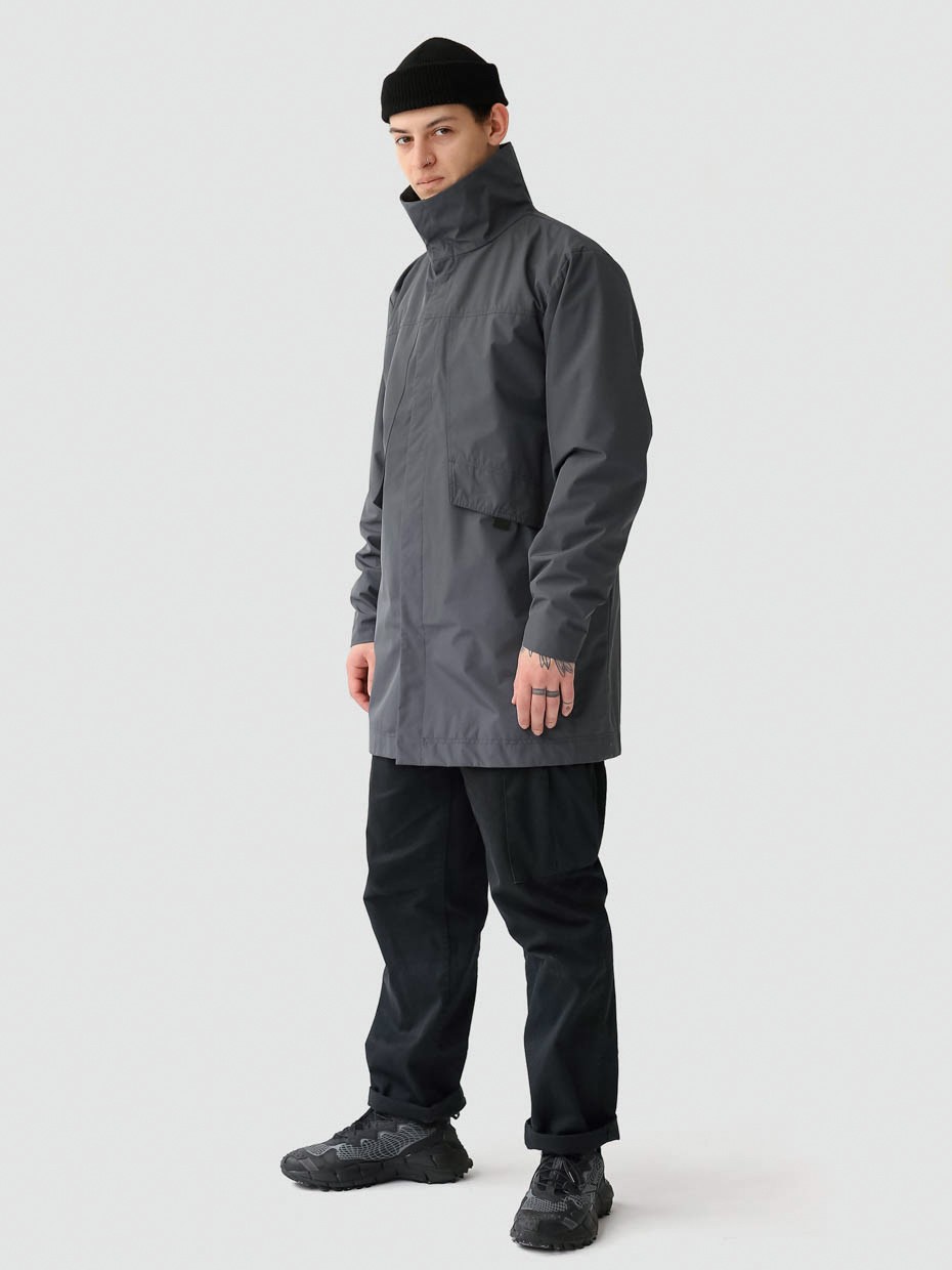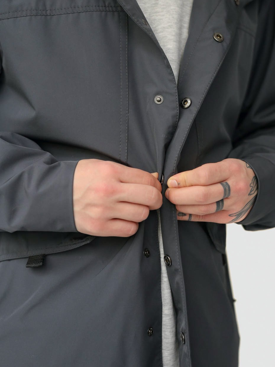 Удлиненная куртка Rob выполнена из мембранной ткани c WR пропиткой. Модель прямого кроя. Высокий воротник-стойка защитит от ветра. Ветрозащитная планка на металлических кнопках по всей длине. Два врезных боковых кармана на молнии, и два внутренних на кнопках. Ширина запястья регулируется металлическими кнопками.