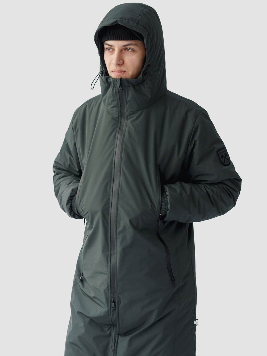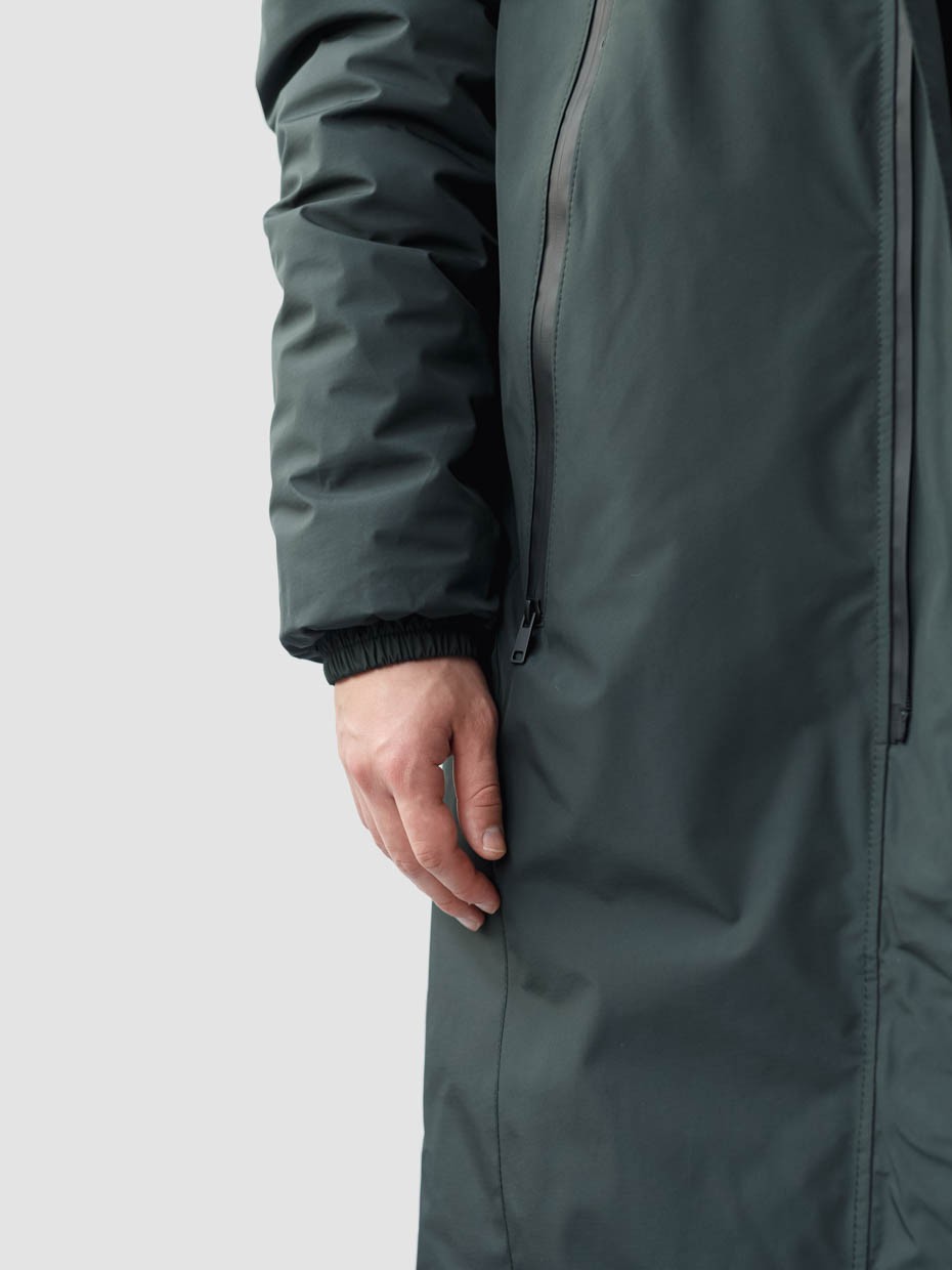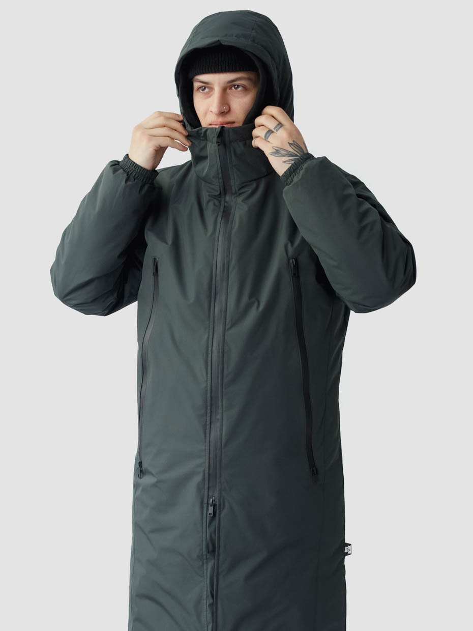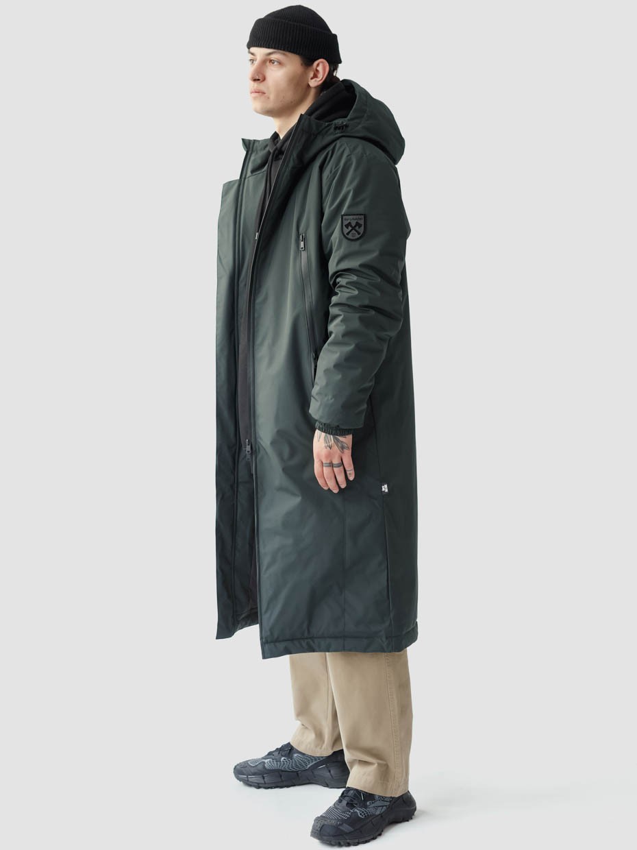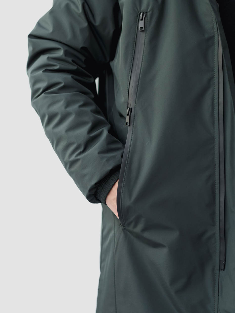 Удлиненная куртка S77 прямого кроя c плотный слоем искусcтвенного утеплителя – ФАЙБЕРТЕК™. Это нетканый материал, представляющий собой объемный слой из композиции тонких пустотелых волокон с элементами объемного термоскрепления.  Куртка выполнена из ткани мембрана – качественная курточная ткань с мембранной отделкой TPU с водоупорностью до 3000 мм. Ткани с такой обработкой надежно защищают от воды и снега. Центральная застежка – двухзамковая молния сделана на 2/3 длины, ниже идут магниты. Модель с комбинированными наружными карманами, которые закрываются одной прорезиненной молнией. Два дополнительных кармана на молнии с внутренней стороны. Объем капюшона регулируется эластичным шнуром с металлическими фиксаторами. Резинка по низу рукава обеспечивает плотное прилегание к запястью.