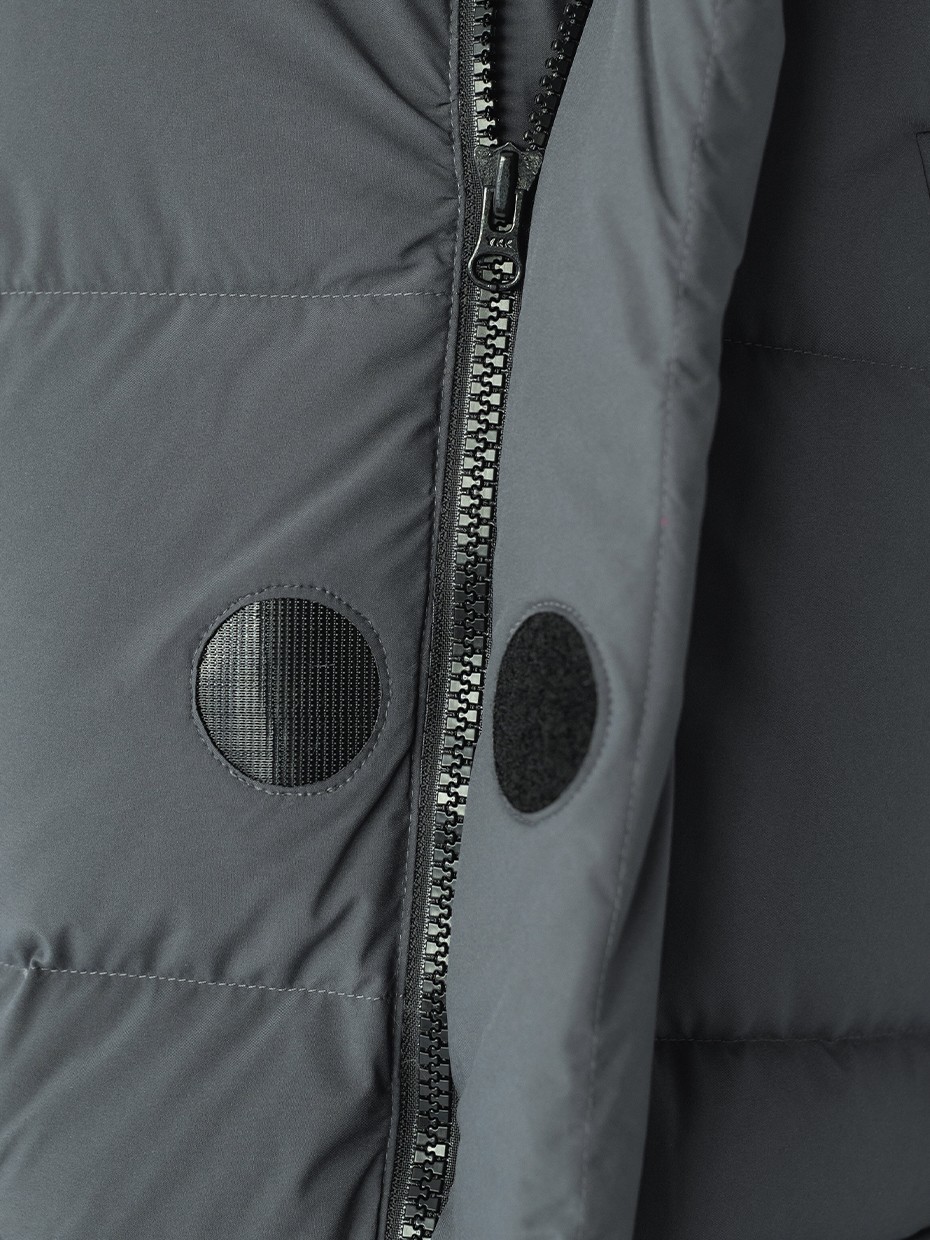 — Отстегивающийся капюшон с высоким воротником, застегивающимся на липучку и кнопку.