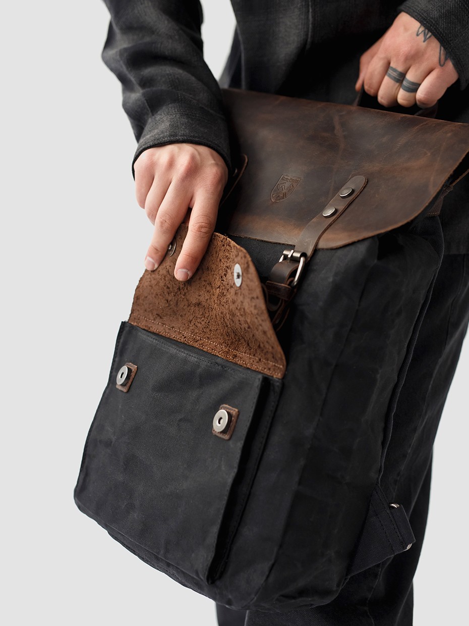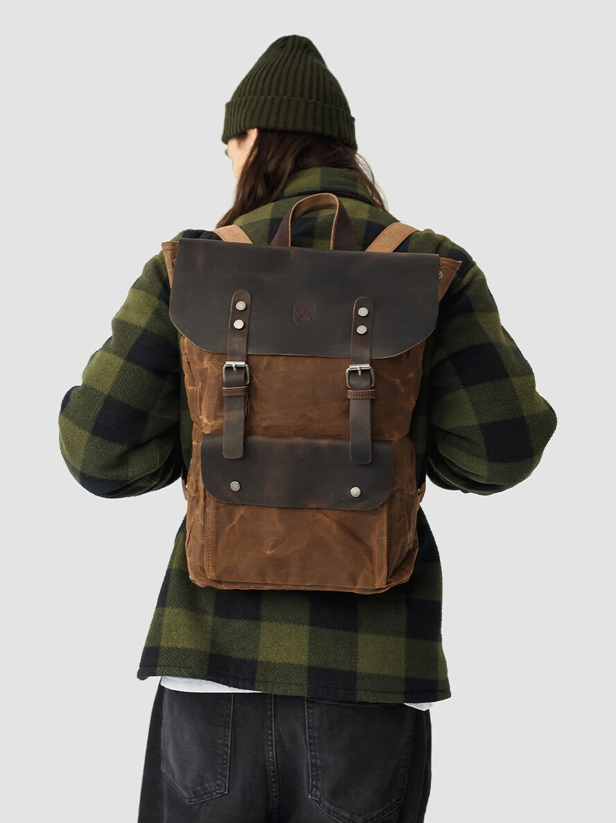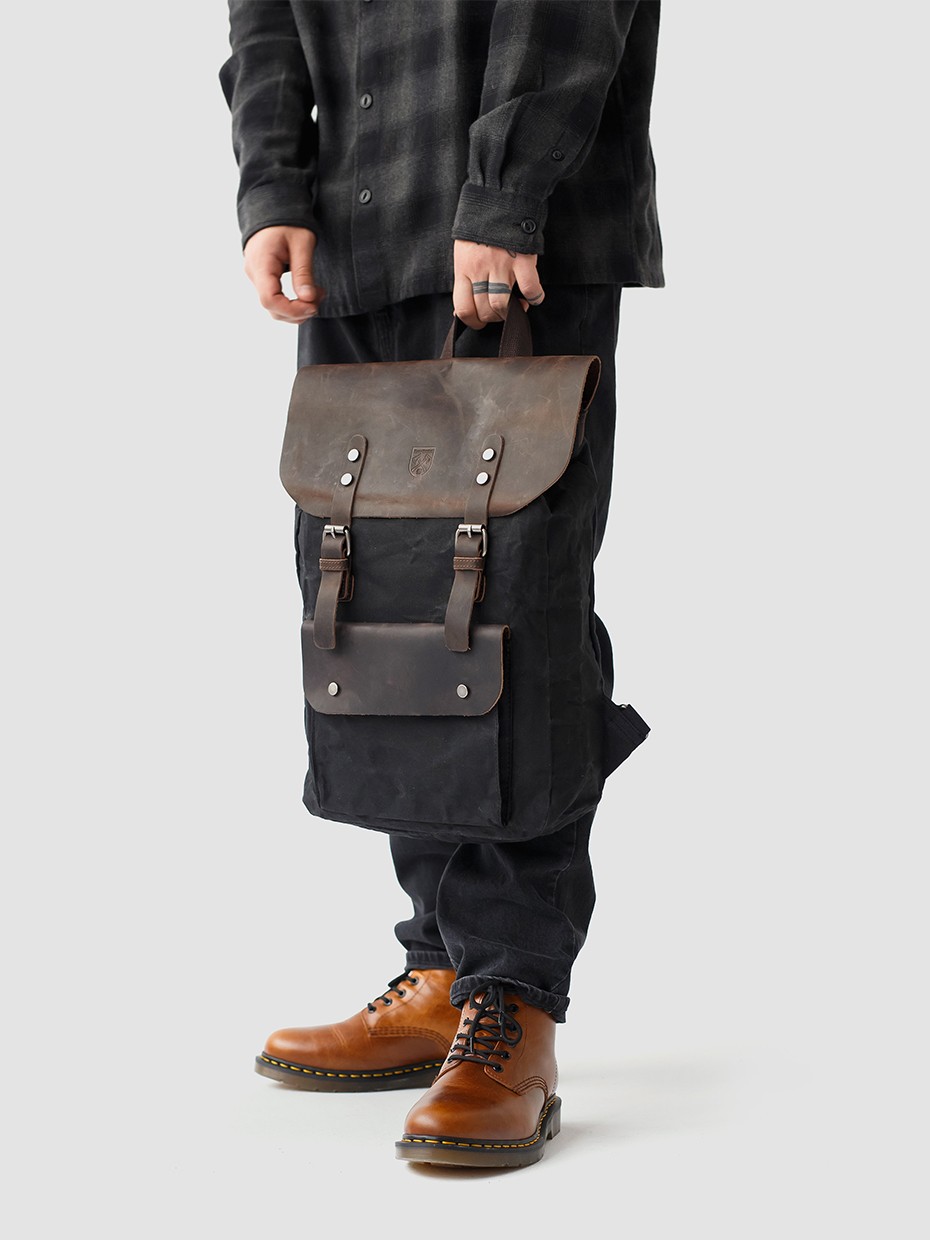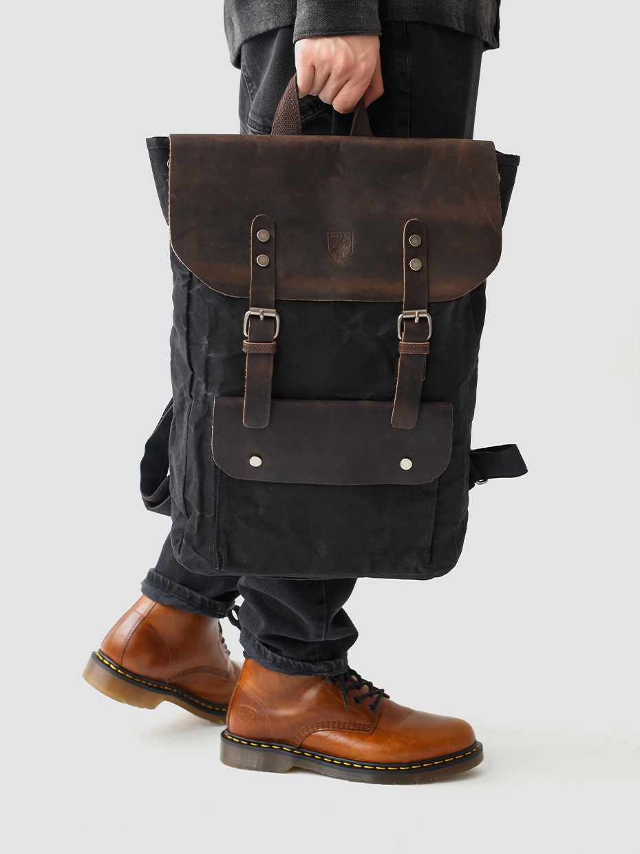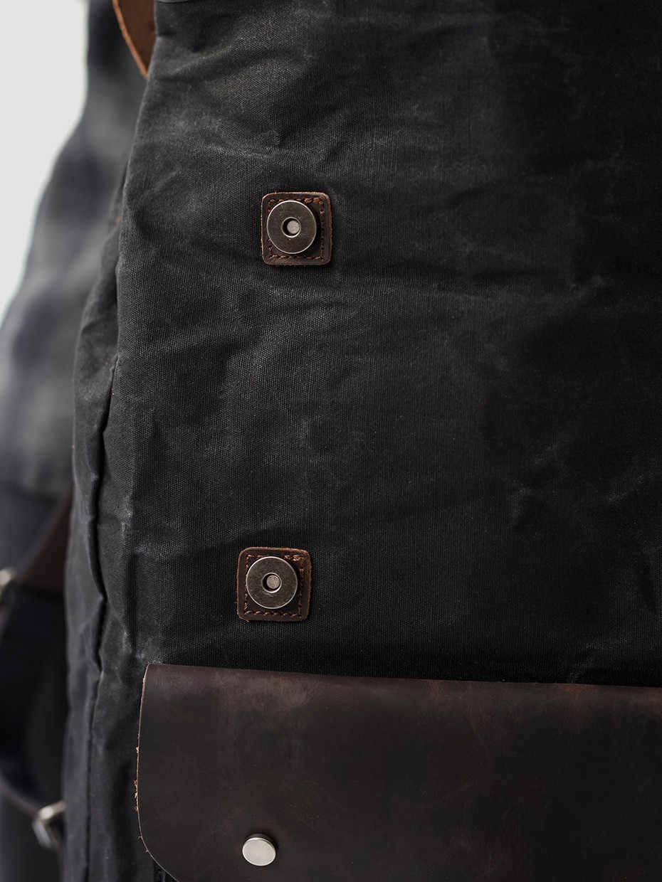 Рюкзак 2166. Рюкзак выполнен из натуральной кожи и высококачественного вощеного хлопка. Рюкзак  устойчив к выгоранию на солнце и имеет много дополнительного места для хранения. Влагостойкий портфель оснащен наружными карманами, регулируемыми ремнями и металлическими кнопками. Большое и вместительное основное отделение закрывается на кнопки и магнит. Внутри рюкзака два кармана на молнии и два маленьких отделения. Небольшой карман-органайзер с клапаном из натуральной кожи на магнитах в передней части рюкзака. Отдельный небольшой карман на спинке под паспорт или кошелек. Крышка-клапан с логотипом-тиснением на ремнях с магнитами. Брендированная подкладка. Предусмотрена петля для переноски рюкзака в руках (например, в транспорте). Высокое качество материалов делает изделие долговечным, а следы износа и естественное старение кожи придает рюкзаку уникальный винтажный вид.