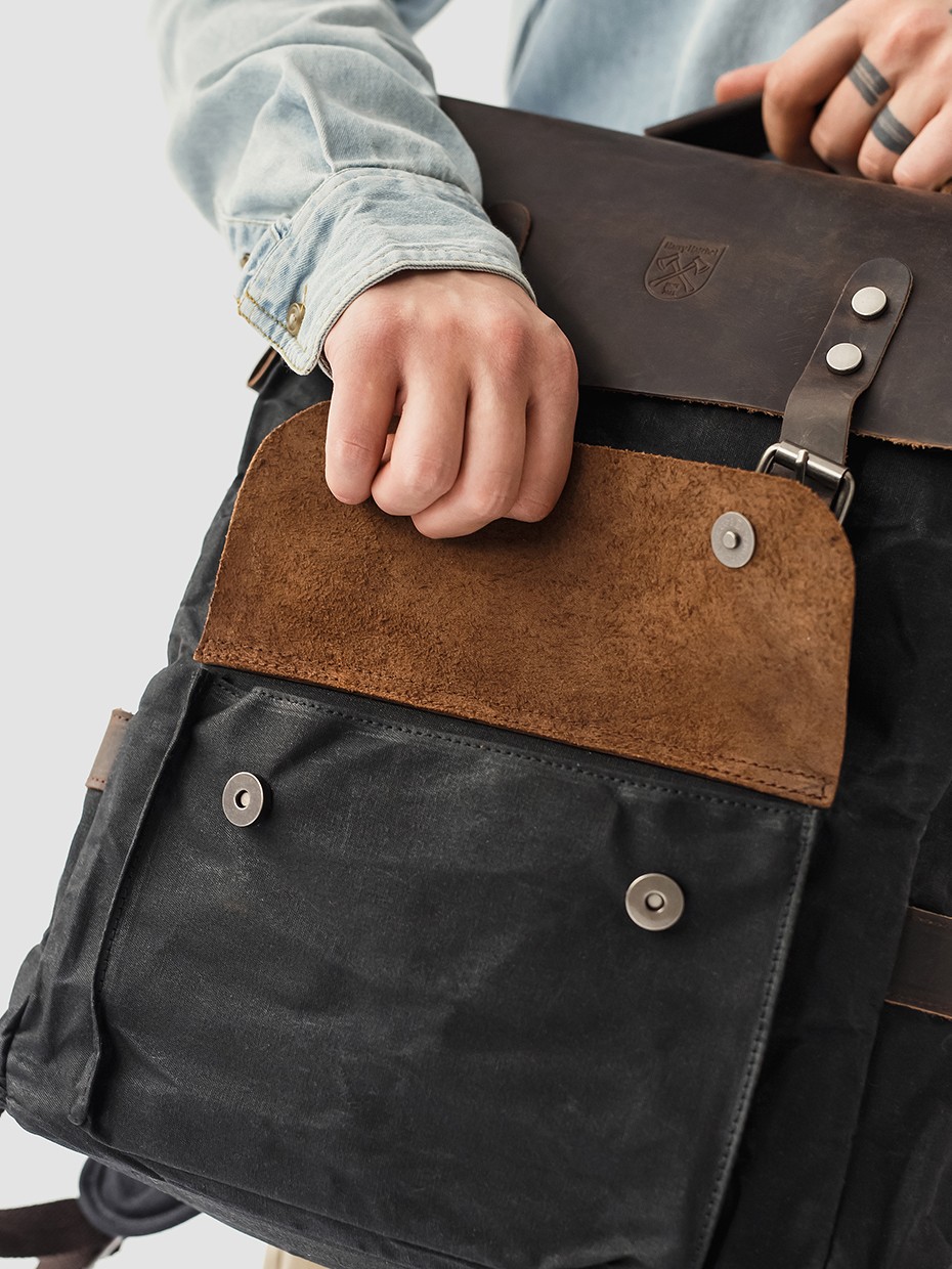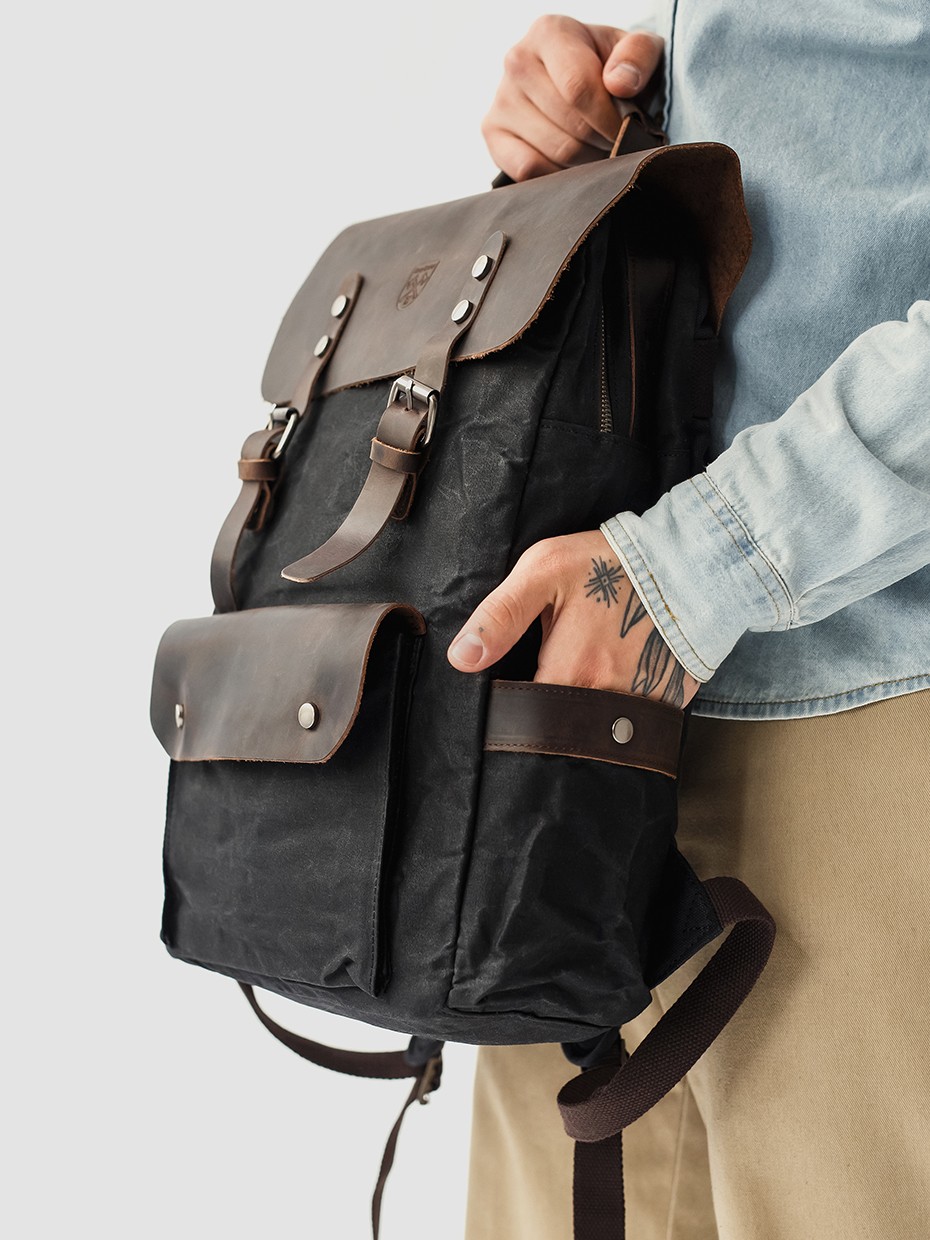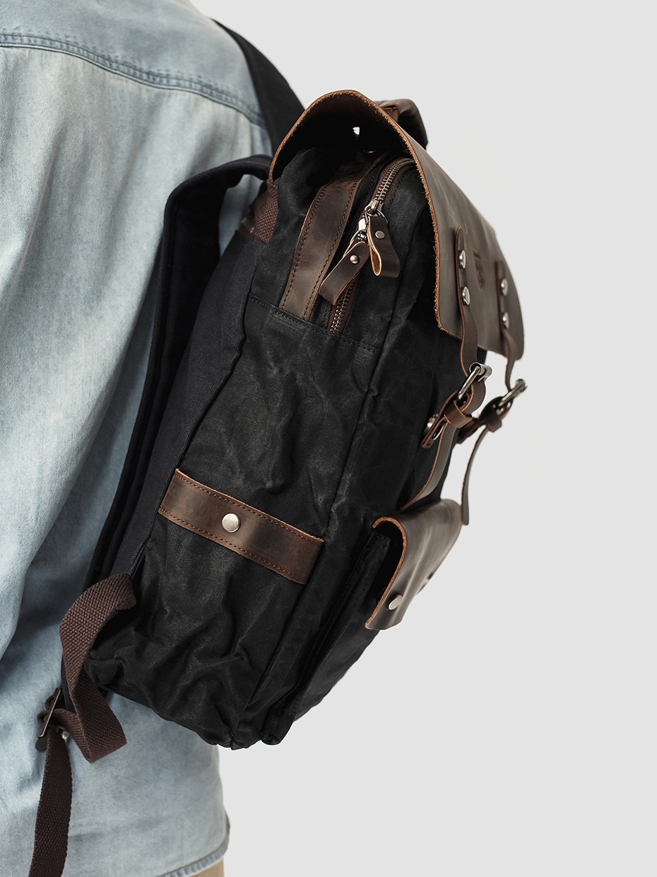 Рюкзак 8064-1. Рюкзак выполнен из натуральной кожи и высококачественного вощеного хлопка. Рюкзак  устойчив к выгоранию на солнце и имеет много дополнительного места для хранения. Влагостойкий портфель оснащен наружными карманами, регулируемыми ремнями и металлической молнией. Большое и вместительное основное отделение. Внутри дополнительный карман для ноутбука до 15 дюймов. Два маленьких отделения внутри. Небольшой карман-органайзер с клапаном из натуральной кожи на магнитах в передней части рюкзака. Два боковых кармана на кнопках для бутылки или термокружки. Отдельный небольшой карман на спинке под паспорт или кошелек. Крышка-клапан с логотипом-тиснением на ремнях с магнитами. Брендированная подкладка. Предусмотрена ручка для переноски рюкзака в руках (например, в транспорте). Высокое качество материалов делает изделие долговечным, а следы износа и естественное старение кожи придает рюкзаку уникальный винтажный вид.