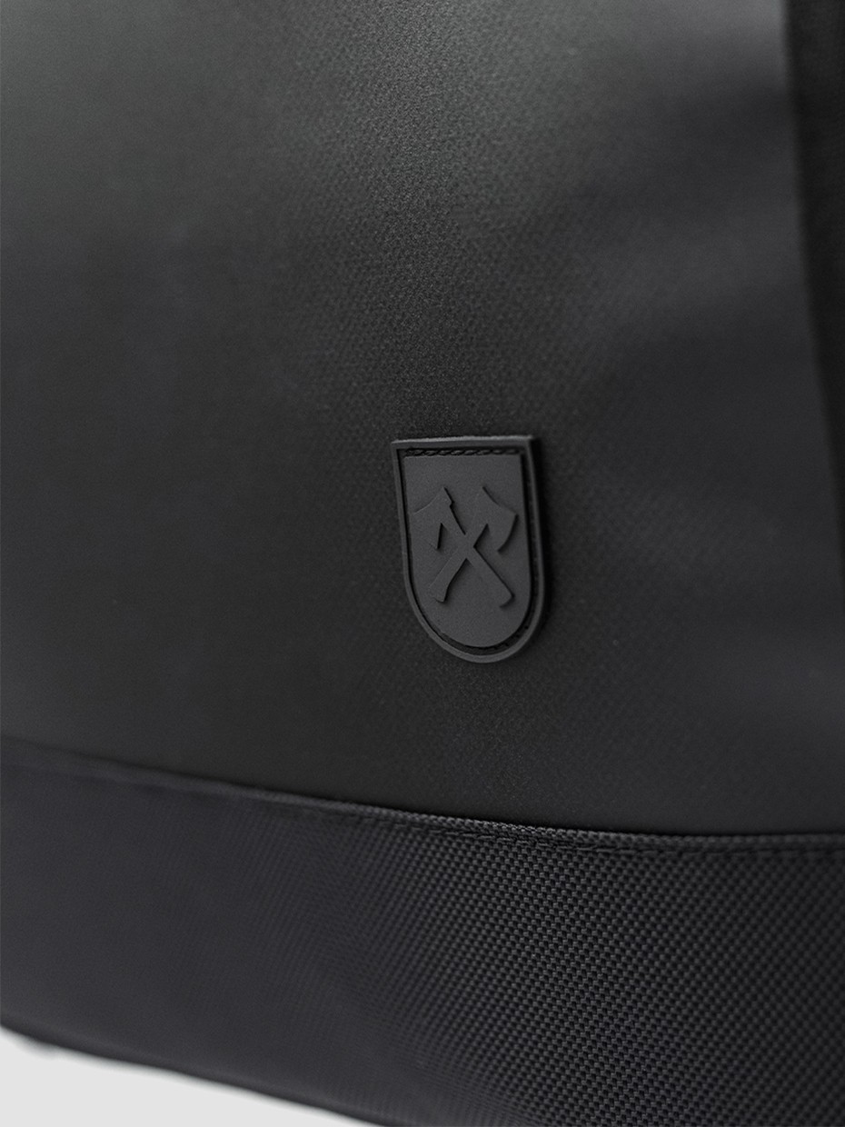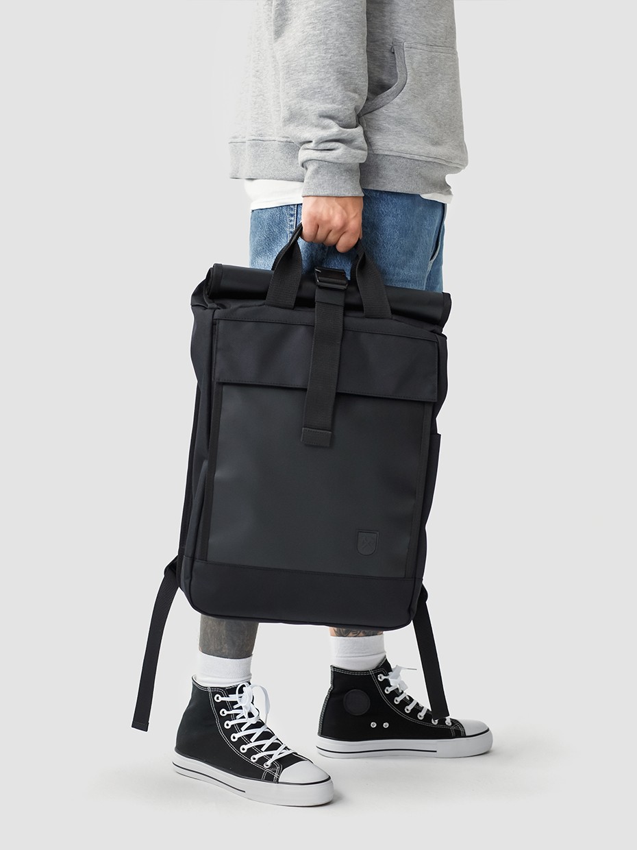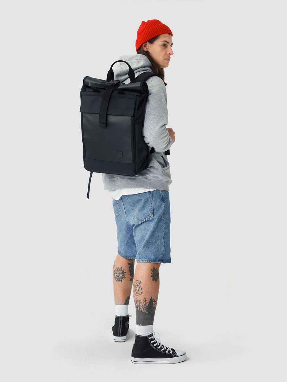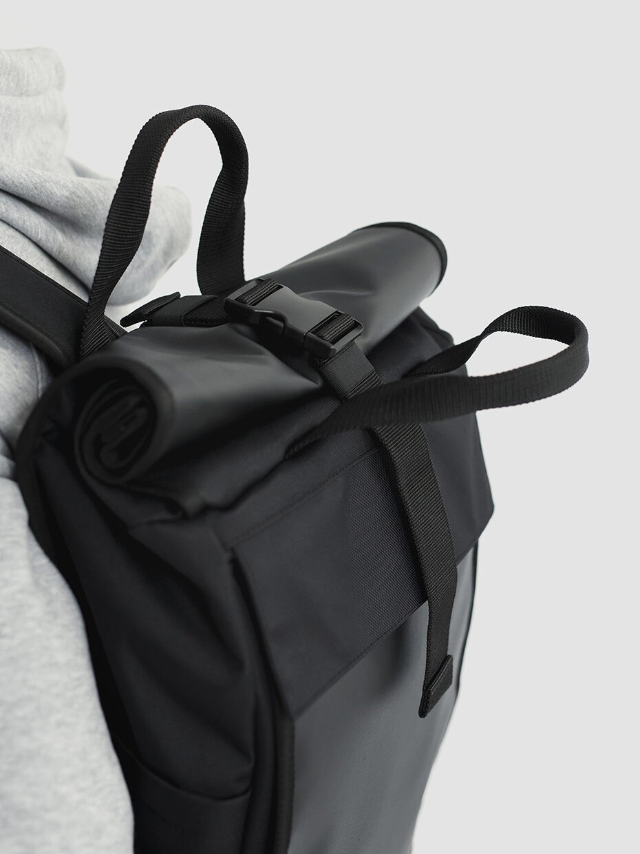 Рюкзак Tech Rolltop. Минималистичный городской рюкзак-роллтоп выполнен с использованием влагостойких и износостойких материалов. Основное отделение закрывается методом скручивания и ремнем с фастексом. Широкий ремень с фастексом прочно удерживает клапан от раскручивания. Внутри имеется карман для ноутбука до 15 дюймов. Объем основного отделения можно регулировать, закручивая верх не до конца. Верхняя прорезиненная ПВХ ткань на 100% защищает от влаги. Также из этого материала сделана стенка переднего комбинированного кармана, который закрывается клапаном. Вместительный внешний карман и карман на молнии закрываются клапаном на липучке. С правой стороны имеется карман для переноски бутылки или термокружки. Спинка сделана из объемной сетки, поролона и плотной пенки внутри. Такая конструкция имеет хорошую жесткость, но в то же время на спине ощущается достаточно мягко. Широкие мягкие регулируемые лямки обеспечивают комфорт в движении. В нижней части спинки предусмотрен дополнительный карман на молнии для документов. Две удобные ручки для переноски рюкзака в руках (например, в транспорте). Для большего удобства шлейки имеют специальную эргономичную форму. Брендированная нашивка на лицевой стороне.