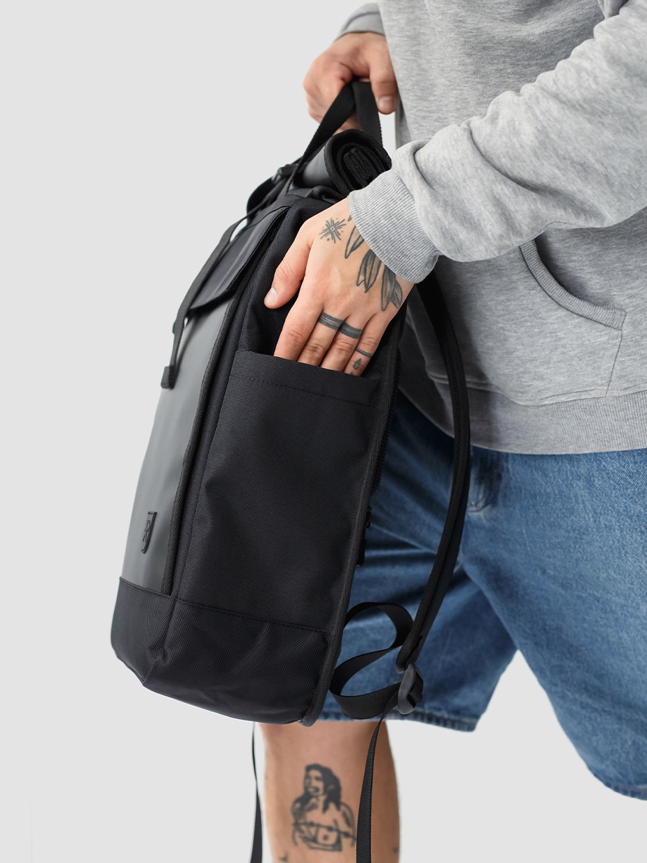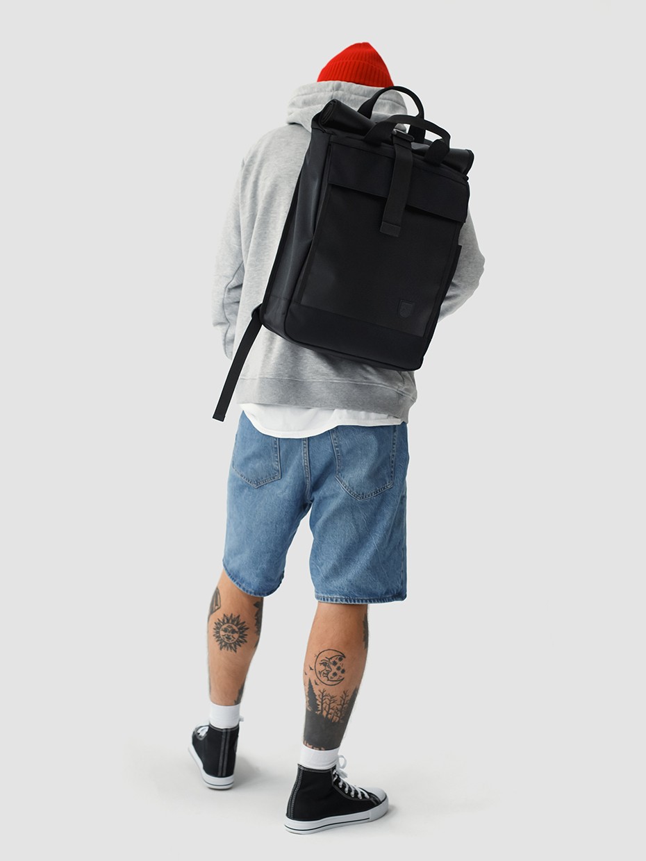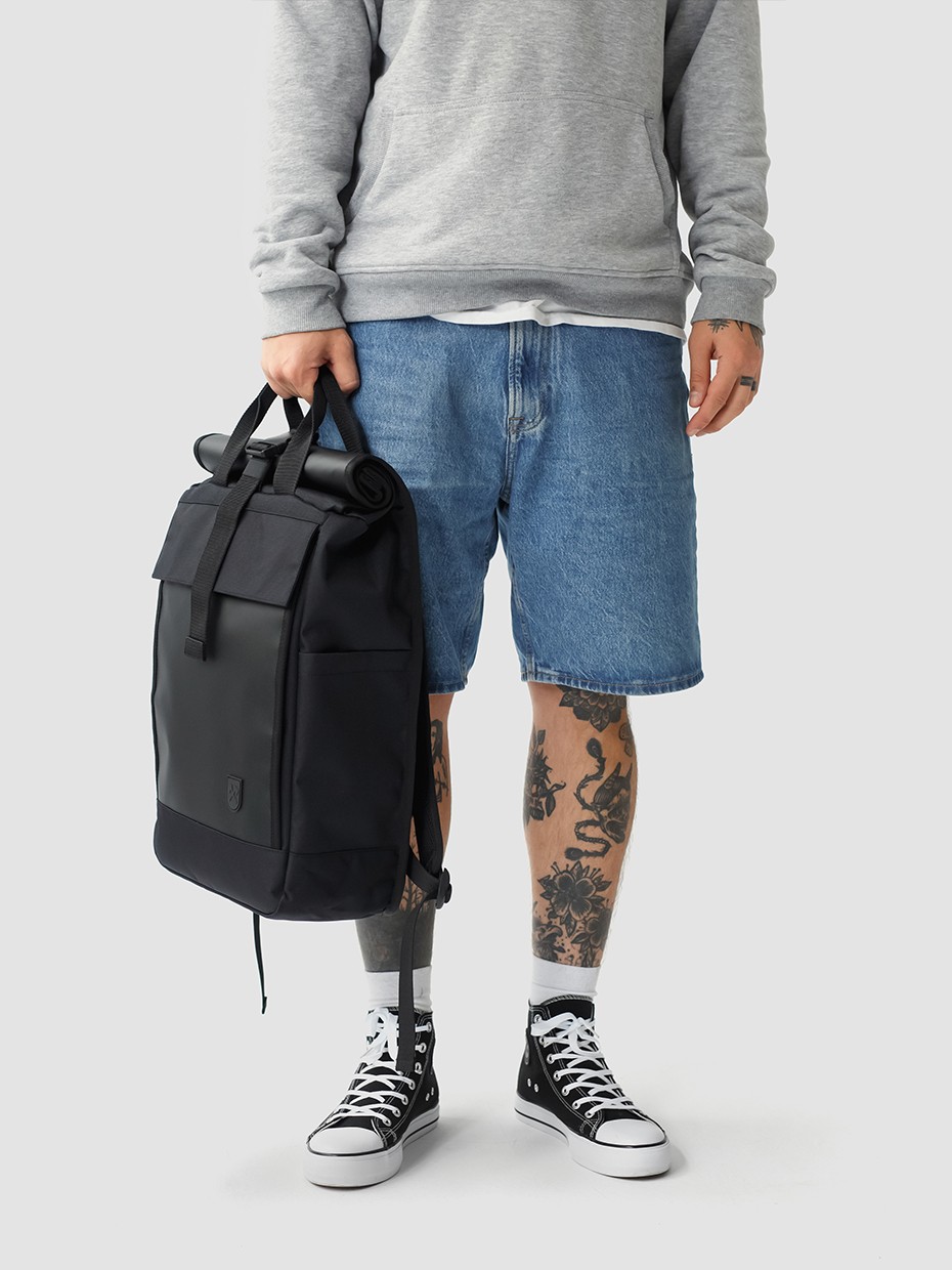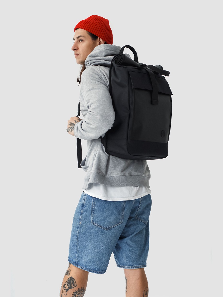 Рюкзак Tech Rolltop. Минималистичный городской рюкзак-роллтоп выполнен с использованием влагостойких и износостойких материалов. Основное отделение закрывается методом скручивания и ремнем с фастексом. Широкий ремень с фастексом прочно удерживает клапан от раскручивания. Внутри имеется карман для ноутбука до 15 дюймов. Объем основного отделения можно регулировать, закручивая верх не до конца. Верхняя прорезиненная ПВХ ткань на 100% защищает от влаги. Также из этого материала сделана стенка переднего комбинированного кармана, который закрывается клапаном. Вместительный внешний карман и карман на молнии закрываются клапаном на липучке. С правой стороны имеется карман для переноски бутылки или термокружки. Спинка сделана из объемной сетки, поролона и плотной пенки внутри. Такая конструкция имеет хорошую жесткость, но в то же время на спине ощущается достаточно мягко. Широкие мягкие регулируемые лямки обеспечивают комфорт в движении. В нижней части спинки предусмотрен дополнительный карман на молнии для документов. Две удобные ручки для переноски рюкзака в руках (например, в транспорте). Для большего удобства шлейки имеют специальную эргономичную форму. Брендированная нашивка на лицевой стороне.