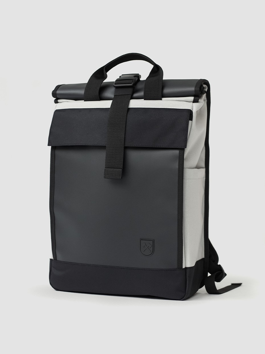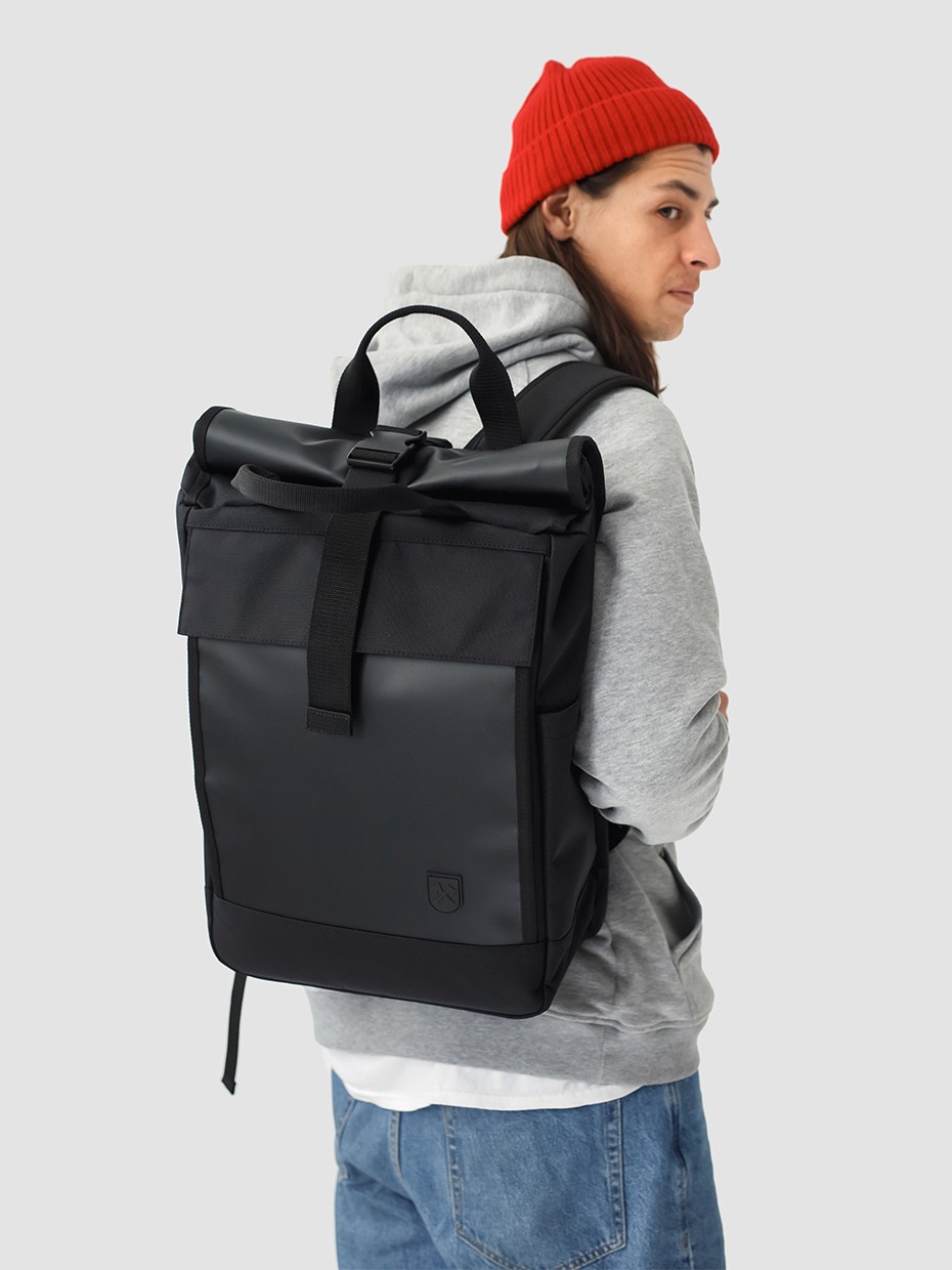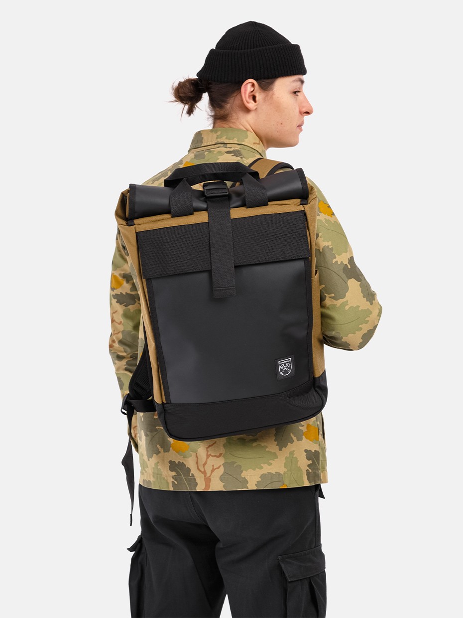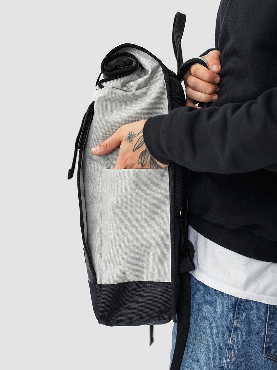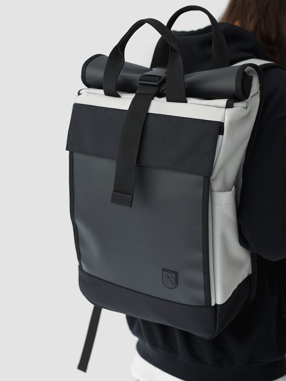 Рюкзак Tech Rolltop. Минималистичный городской рюкзак-роллтоп выполнен с использованием влагостойких и износостойких материалов. Основное отделение закрывается методом скручивания и ремнем с фастексом. Широкий ремень с фастексом прочно удерживает клапан от раскручивания. Внутри имеется карман для ноутбука до 15 дюймов. Объем основного отделения можно регулировать, закручивая верх не до конца. Верхняя прорезиненная ПВХ ткань на 100% защищает от влаги. Также из этого материала сделана стенка переднего комбинированного кармана, который закрывается клапаном. Вместительный внешний карман и карман на молнии закрываются клапаном на липучке. С правой стороны имеется карман для переноски бутылки или термокружки. Спинка сделана из объемной сетки, поролона и плотной пенки внутри. Такая конструкция имеет хорошую жесткость, но в то же время на спине ощущается достаточно мягко. Широкие мягкие регулируемые лямки обеспечивают комфорт в движении. В нижней части спинки предусмотрен дополнительный карман на молнии для документов. Две удобные ручки для переноски рюкзака в руках (например, в транспорте). Для большего удобства шлейки имеют специальную эргономичную форму. Брендированная нашивка на лицевой стороне.