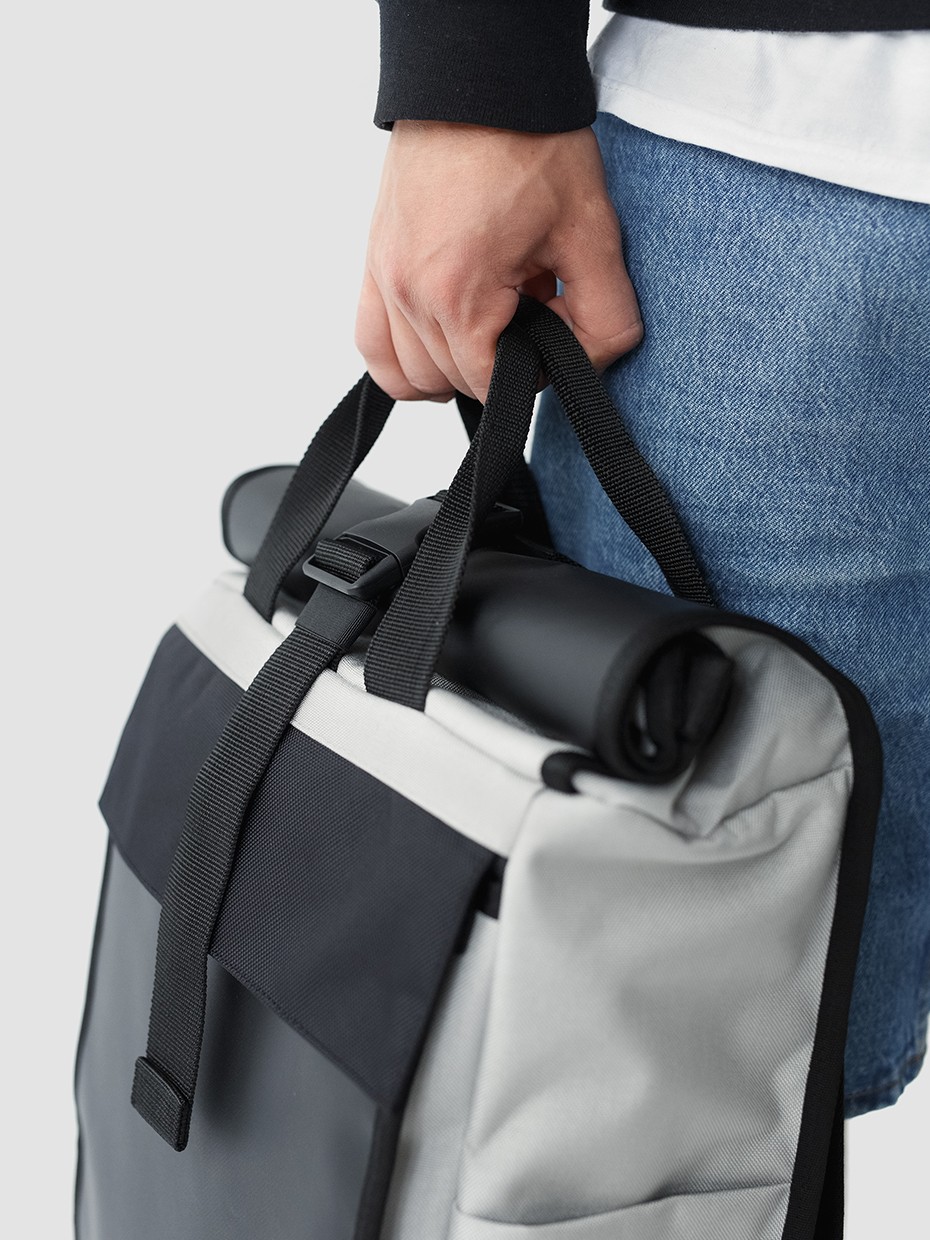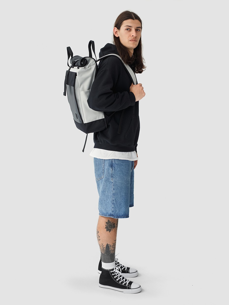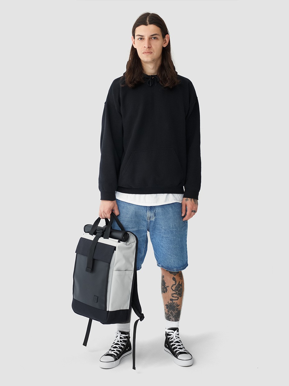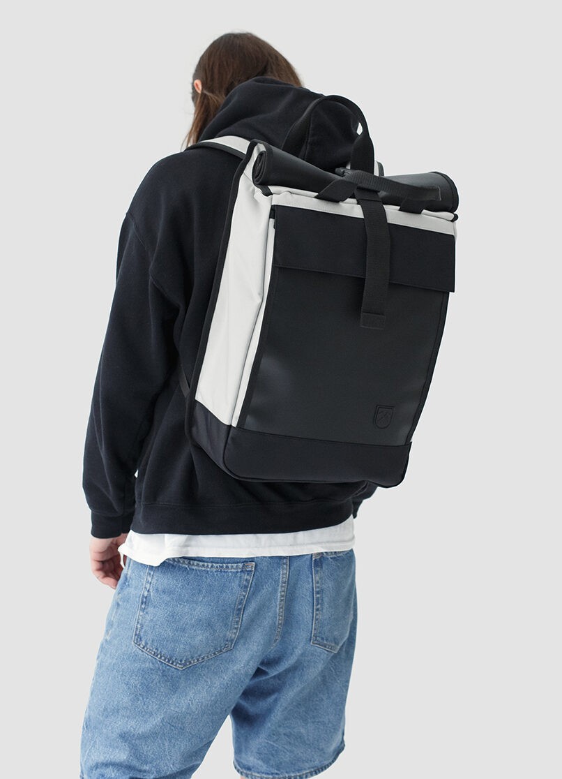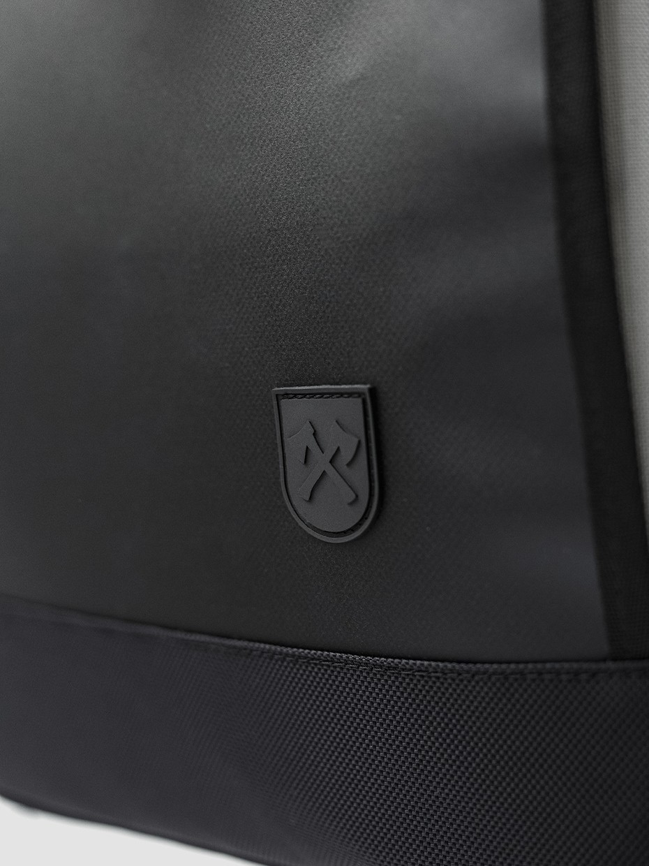 Рюкзак Tech Rolltop. Минималистичный городской рюкзак-роллтоп выполнен с использованием влагостойких и износостойких материалов. Основное отделение закрывается методом скручивания и ремнем с фастексом. Широкий ремень с фастексом прочно удерживает клапан от раскручивания. Внутри имеется карман для ноутбука до 15 дюймов. Объем основного отделения можно регулировать, закручивая верх не до конца. Верхняя прорезиненная ПВХ ткань на 100% защищает от влаги. Также из этого материала сделана стенка переднего комбинированного кармана, который закрывается клапаном. Вместительный внешний карман и карман на молнии закрываются клапаном на липучке. С правой стороны имеется карман для переноски бутылки или термокружки. Спинка сделана из объемной сетки, поролона и плотной пенки внутри. Такая конструкция имеет хорошую жесткость, но в то же время на спине ощущается достаточно мягко. Широкие мягкие регулируемые лямки обеспечивают комфорт в движении. В нижней части спинки предусмотрен дополнительный карман на молнии для документов. Две удобные ручки для переноски рюкзака в руках (например, в транспорте). Для большего удобства шлейки имеют специальную эргономичную форму. Брендированная нашивка на лицевой стороне.