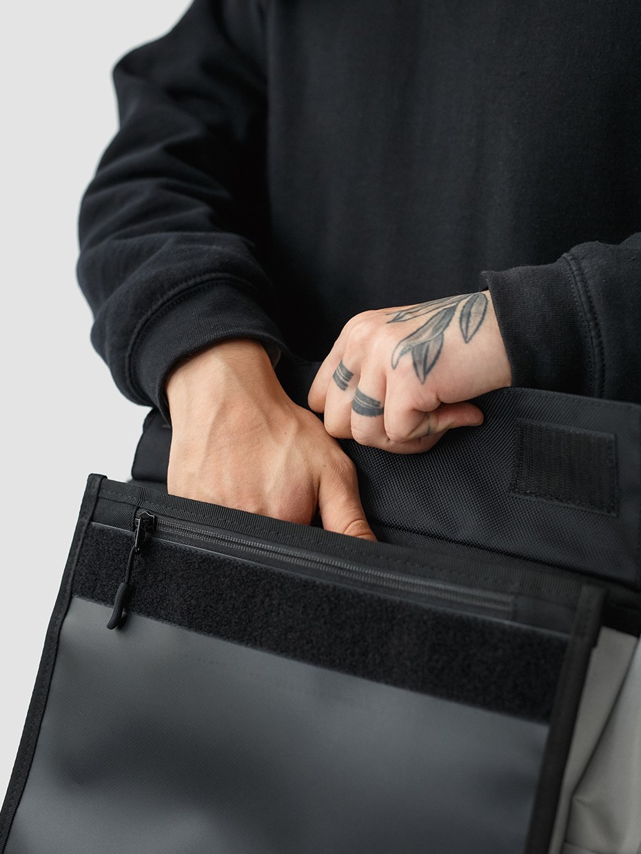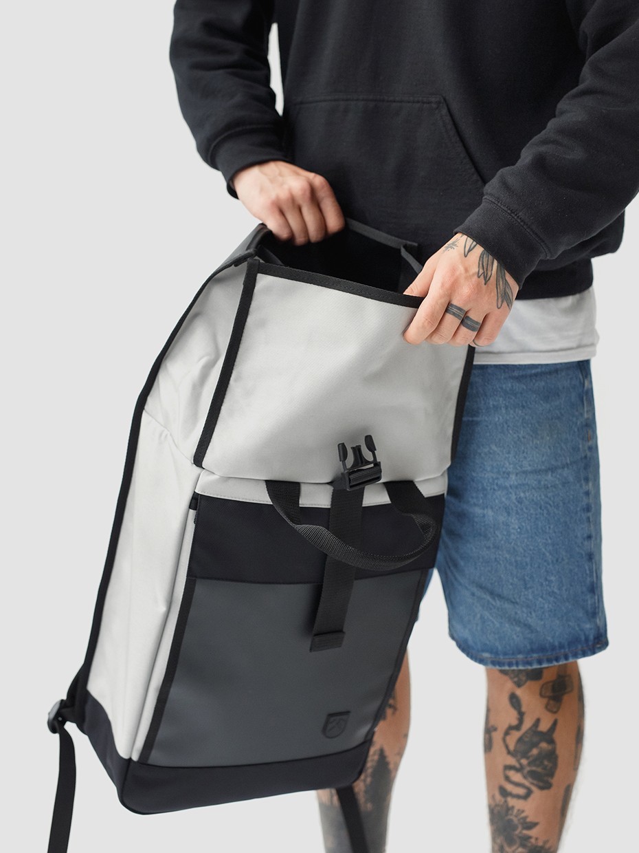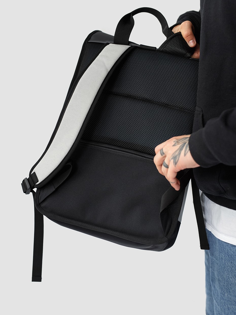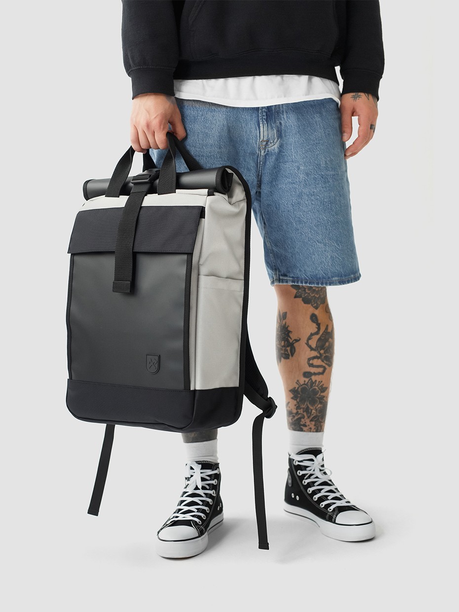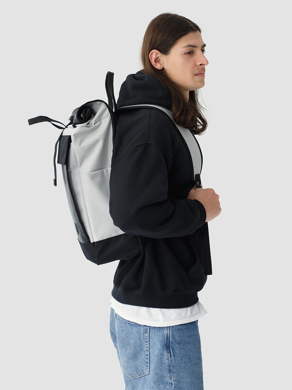 Рюкзак Tech Rolltop. Минималистичный городской рюкзак-роллтоп выполнен с использованием влагостойких и износостойких материалов. Основное отделение закрывается методом скручивания и ремнем с фастексом. Широкий ремень с фастексом прочно удерживает клапан от раскручивания. Внутри имеется карман для ноутбука до 15 дюймов. Объем основного отделения можно регулировать, закручивая верх не до конца. Верхняя прорезиненная ПВХ ткань на 100% защищает от влаги. Также из этого материала сделана стенка переднего комбинированного кармана, который закрывается клапаном. Вместительный внешний карман и карман на молнии закрываются клапаном на липучке. С правой стороны имеется карман для переноски бутылки или термокружки. Спинка сделана из объемной сетки, поролона и плотной пенки внутри. Такая конструкция имеет хорошую жесткость, но в то же время на спине ощущается достаточно мягко. Широкие мягкие регулируемые лямки обеспечивают комфорт в движении. В нижней части спинки предусмотрен дополнительный карман на молнии для документов. Две удобные ручки для переноски рюкзака в руках (например, в транспорте). Для большего удобства шлейки имеют специальную эргономичную форму. Брендированная нашивка на лицевой стороне.